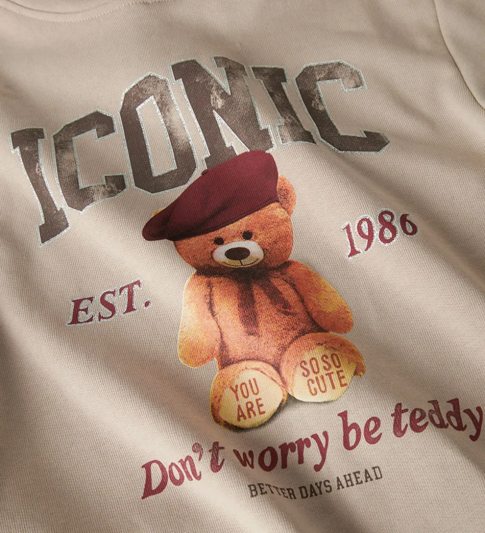 Charmerende Name It hættetrøje i en lysebeige nuance med et sødt print af en bamse på fronten. Bamsen bærer en rød hat, og teksten “ICONIC” er trykt i metalfarver.