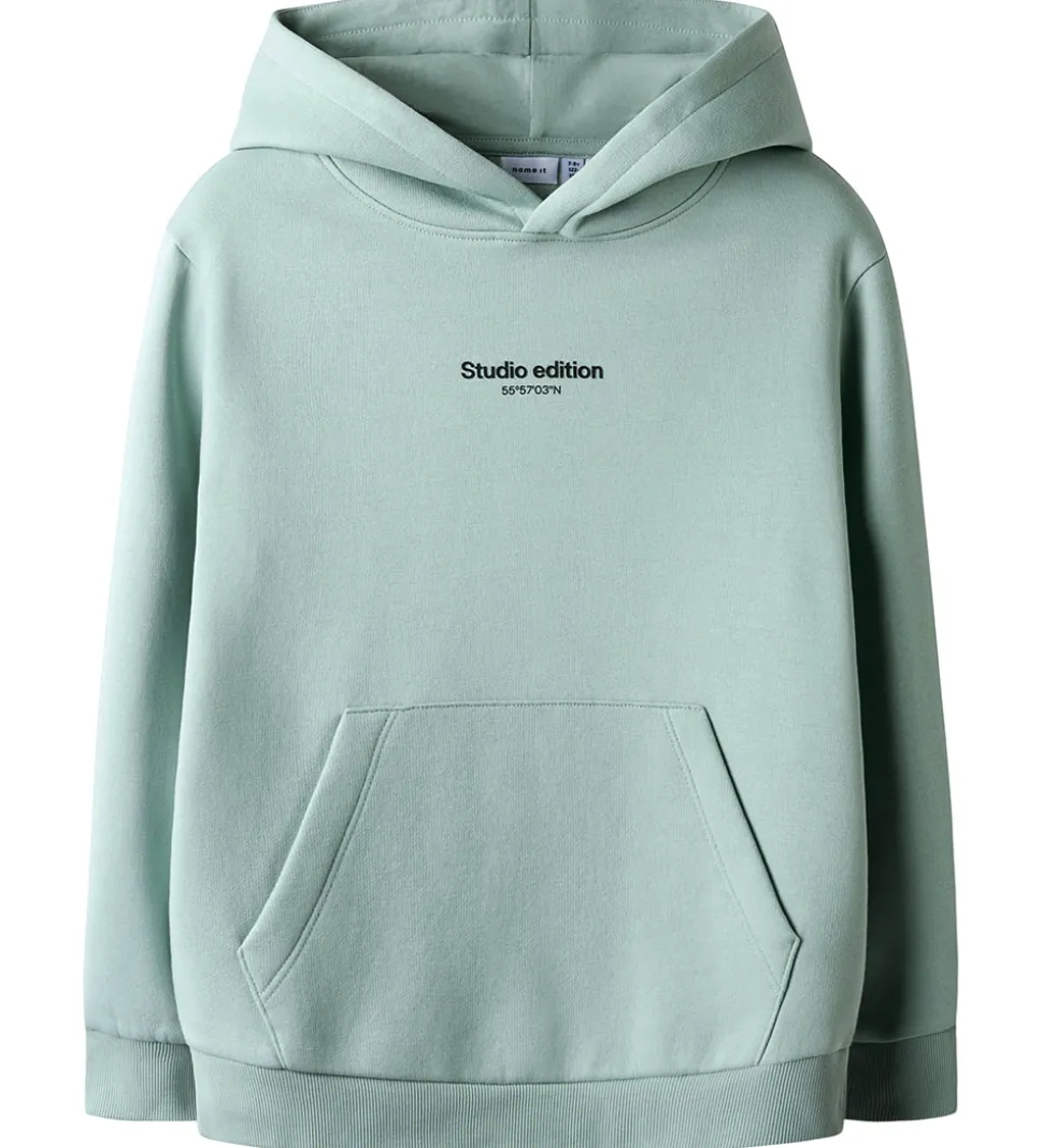 Sej Name It hættetrøje i en blød, mintgrøn farve med et diskret “Studio Edition” print i sort gummi på brystet. Hættetrøjen fra Name It har en fastsyet hætte og behagelig kængurulomme foran. Den har lange ærmer med brede ribkanter i ærme- og taljeåbning. Indvendigt er der blødt, børstet bomuld.