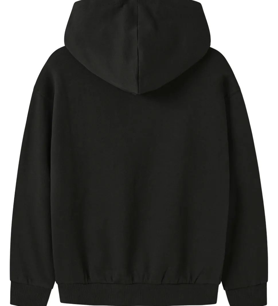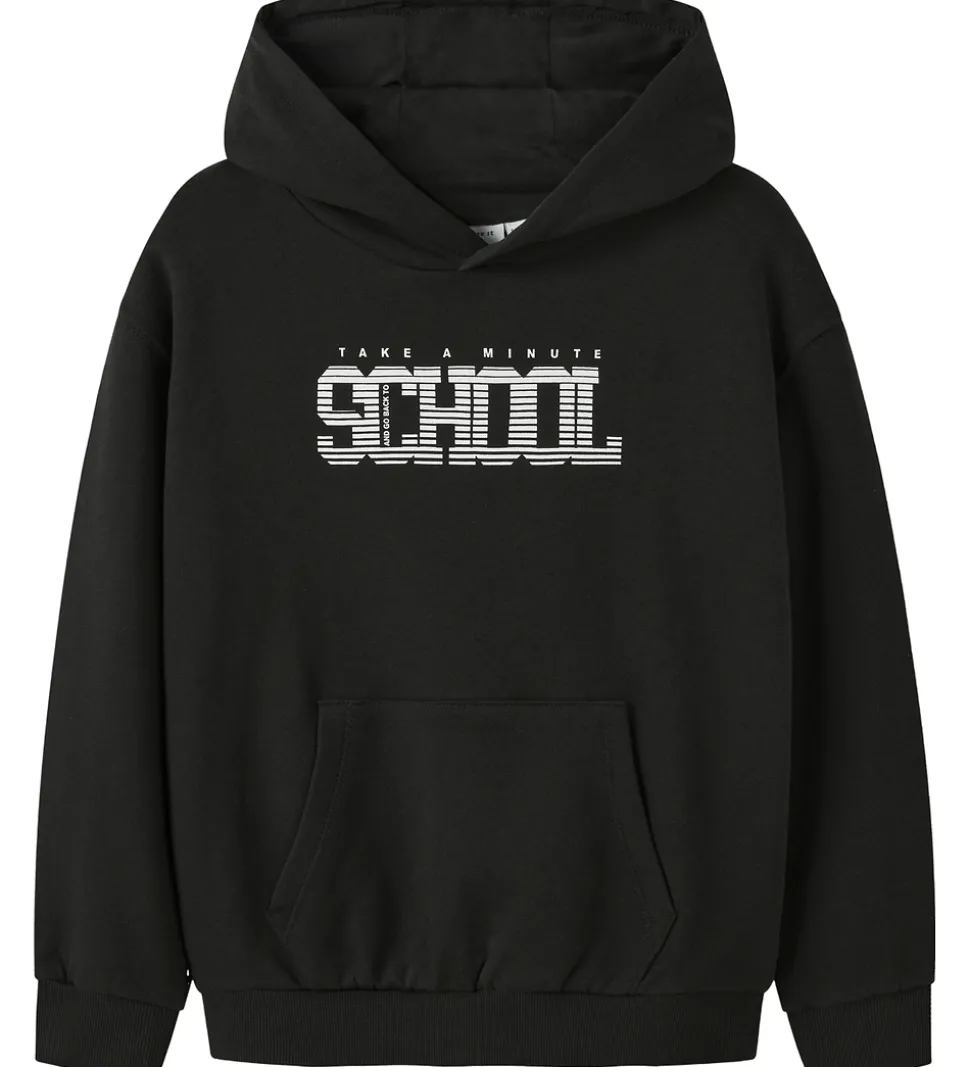 Flot Name It hættetrøje i en klassisk sort farve med hvid tekst på fronten, hvor der står “Take A Minute School”. Hættetrøjen har en rummelig kængurulomme på forsiden. For enden af ærmerne og i taljen findes brede ribkanter, som giver en god pasform. Name It hættetrøjen har blødt børstet bomuld på indersiden.