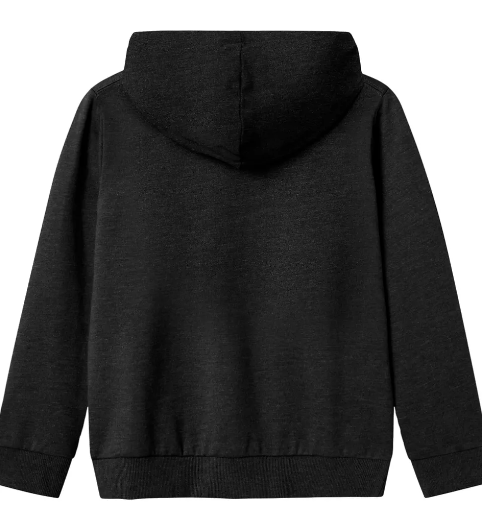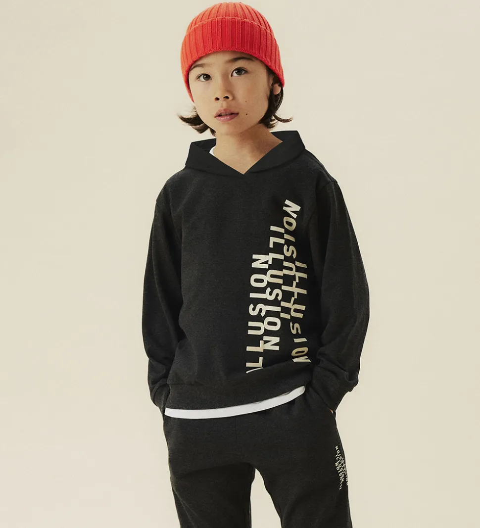 Moderne hættetrøje fra Name It i meleret koksgrå med et vertikalt print i venstre side med teksten “Illusion” i hvid. Hættetrøjen har en blød hætte og lange ærmer med ribkanter i ærme- og taljeåbning. Indvendigt er der blødt, børstet bomuld.