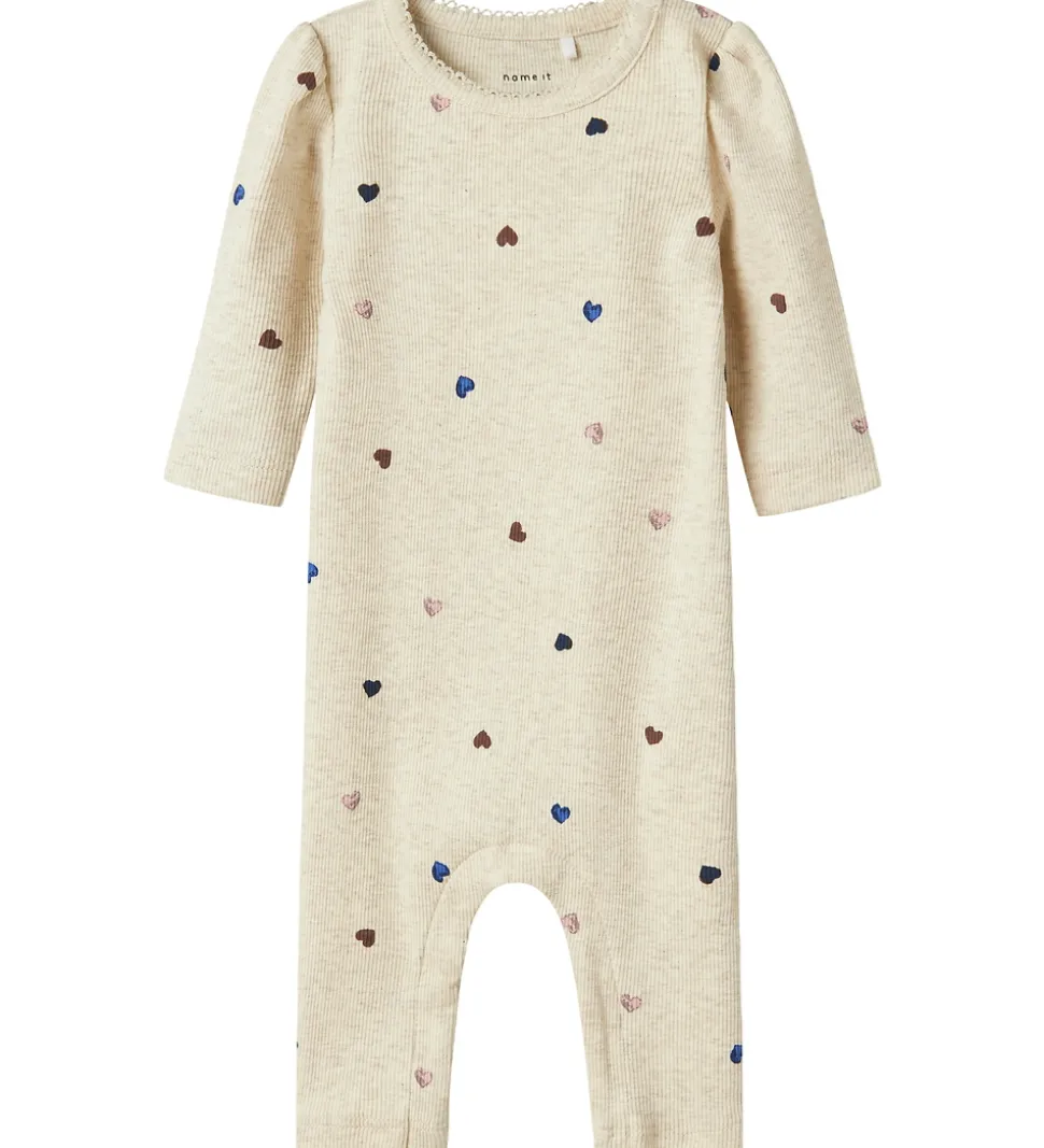 Charmerende Name It heldragt i en meleret beige ribkvalitet og med et allover hjertemønster i blå, rosa og mørkebrun. Name It heldragten lukkes med skjulte trykknapper over venstre skulder og hele vejen mellem benene. Den runde halsudskæring har en dekorativ, smal blondekant.