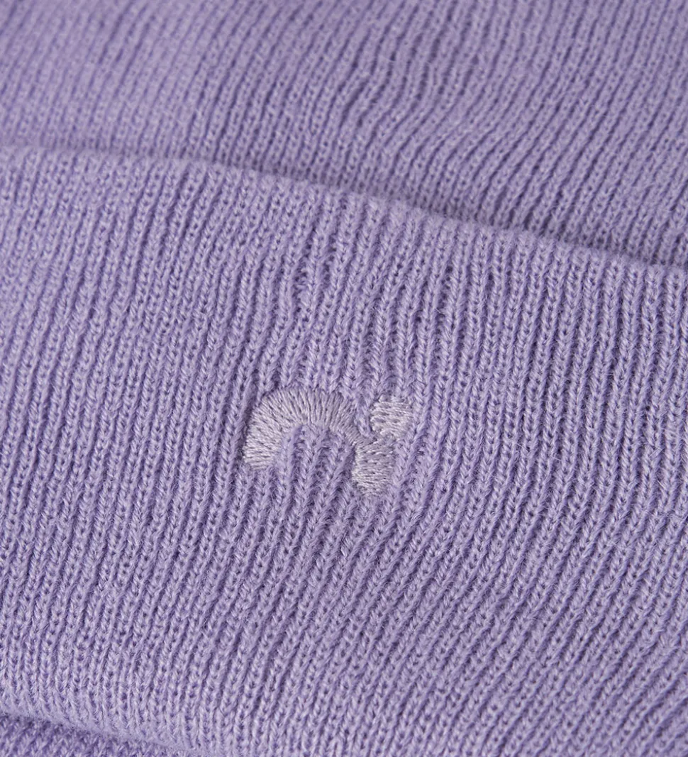 Fin Name It hue i lilla strik med et diskret, broderet logo på fronten. Huen består af to lag med vindblokering ved ørerne, som beskytter ørerne mod kold vind. Huen har en rund hovedform med et bredt ombuk nederst.