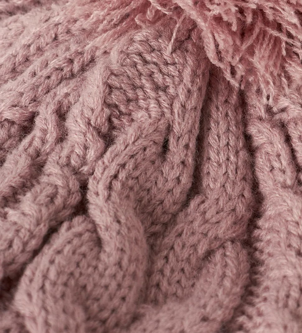 Smart Name It hue i en blød rosa nuance med flot kabelstrik og en kvast på toppen. Huen har et bredt ombuk forneden og indvendigt er der blødt fleecefor.