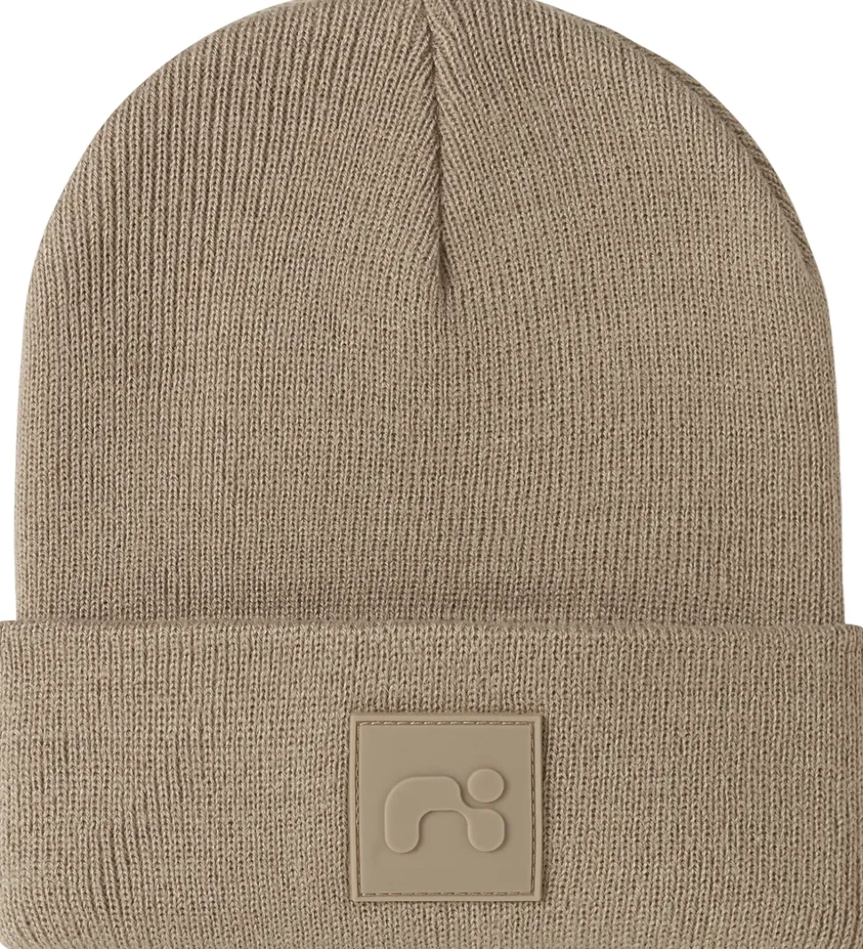 Lækker Name It hue i lysebrun med et diskret gummilogo på fronten. Huen har en flot ribstrikket struktur, og en rund hovedform med et bredt ombuk forneden.