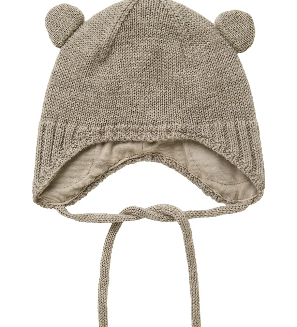 Charmerende Name It hue i lysebrun med påsyede ører, der stikker ud fra toppen af huen.