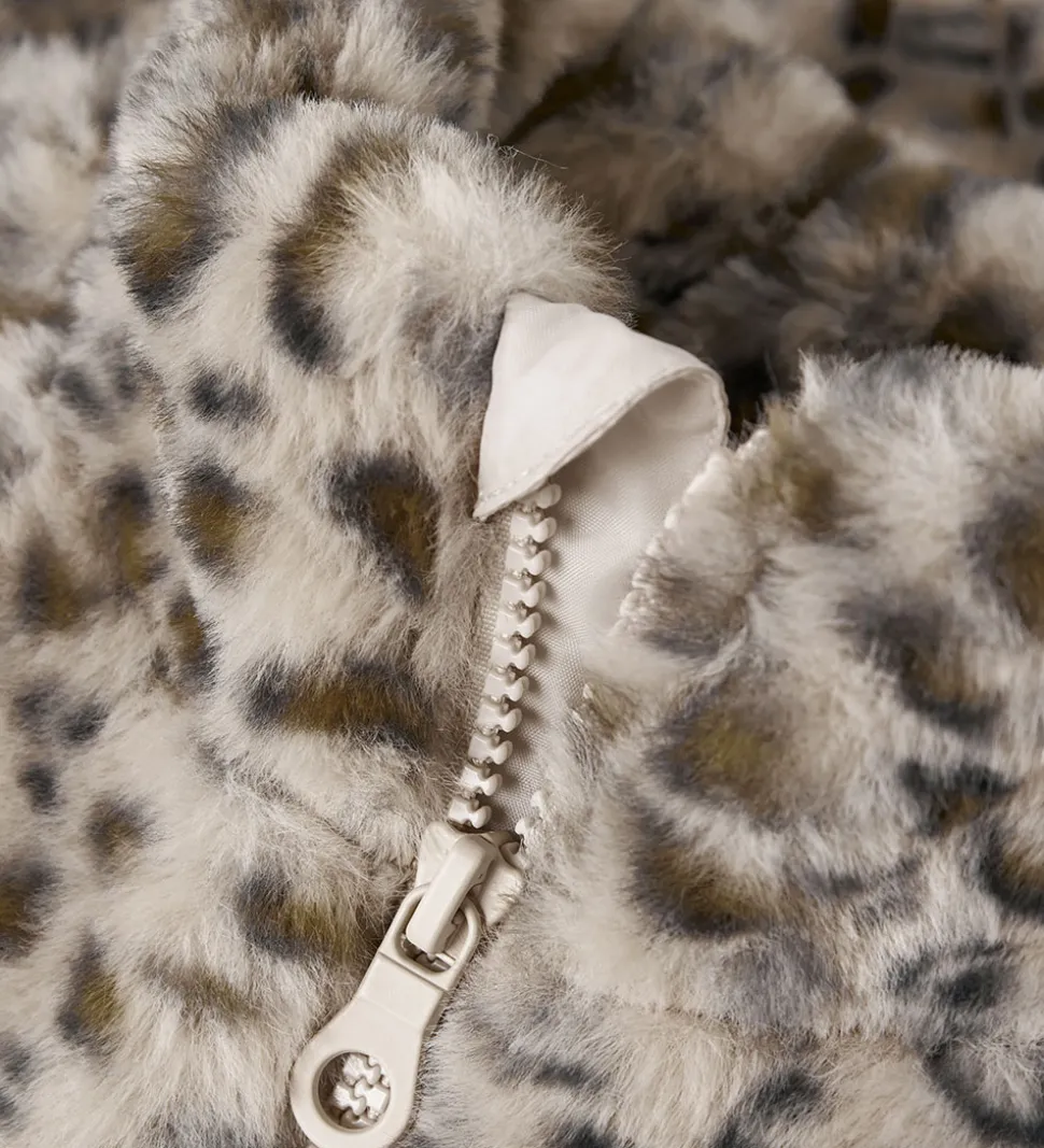Blød Name It jakke af imiteret pels i et beige og brunt leopardmønster.