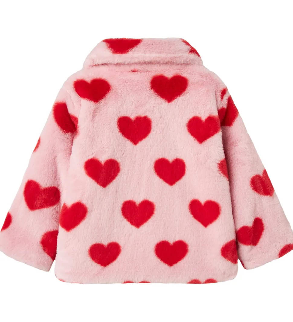 Dejlig Name It jakke af imiteret pels og i en lys rosa farve med røde hjerteprint. Name It jakken har en blød finish og en praktisk lynlåslukning samt åbne lommer i siderne. Perfekt til at holde børn varme i koldere vejr.