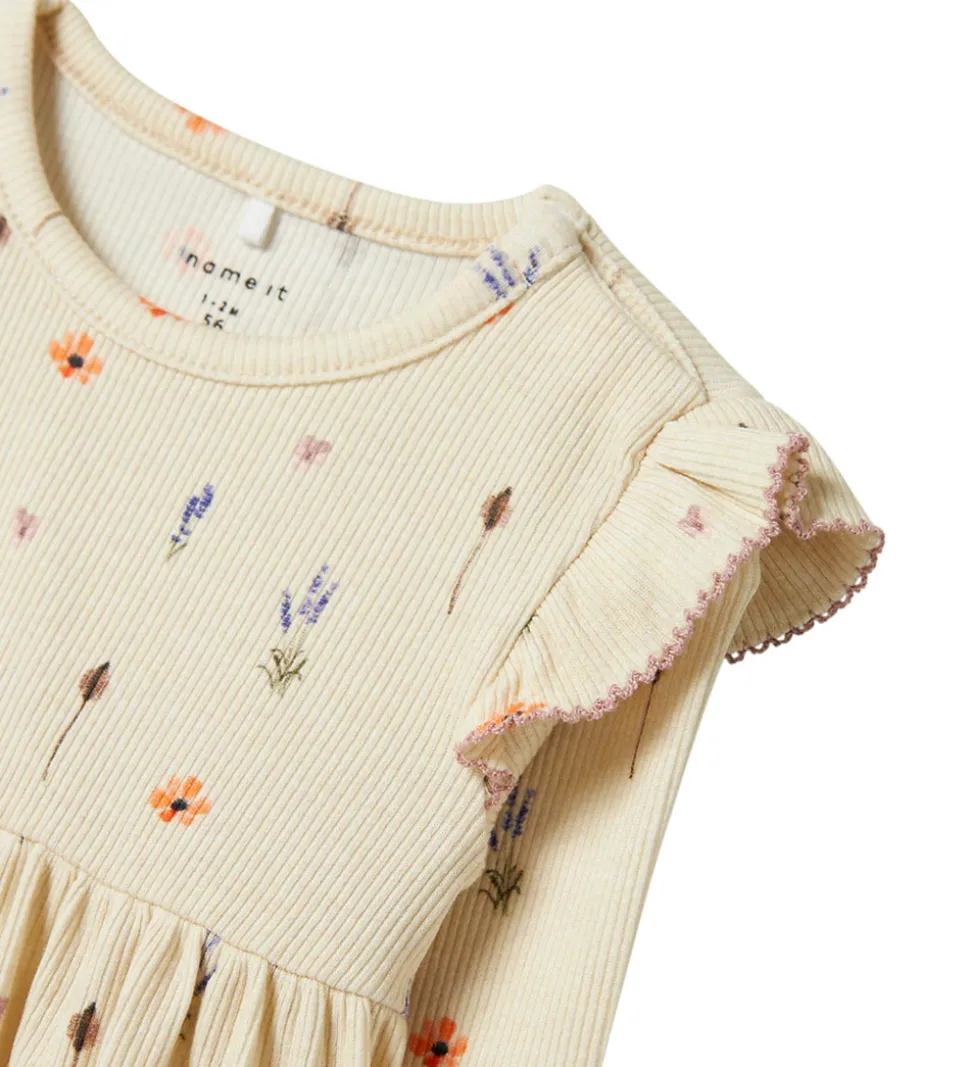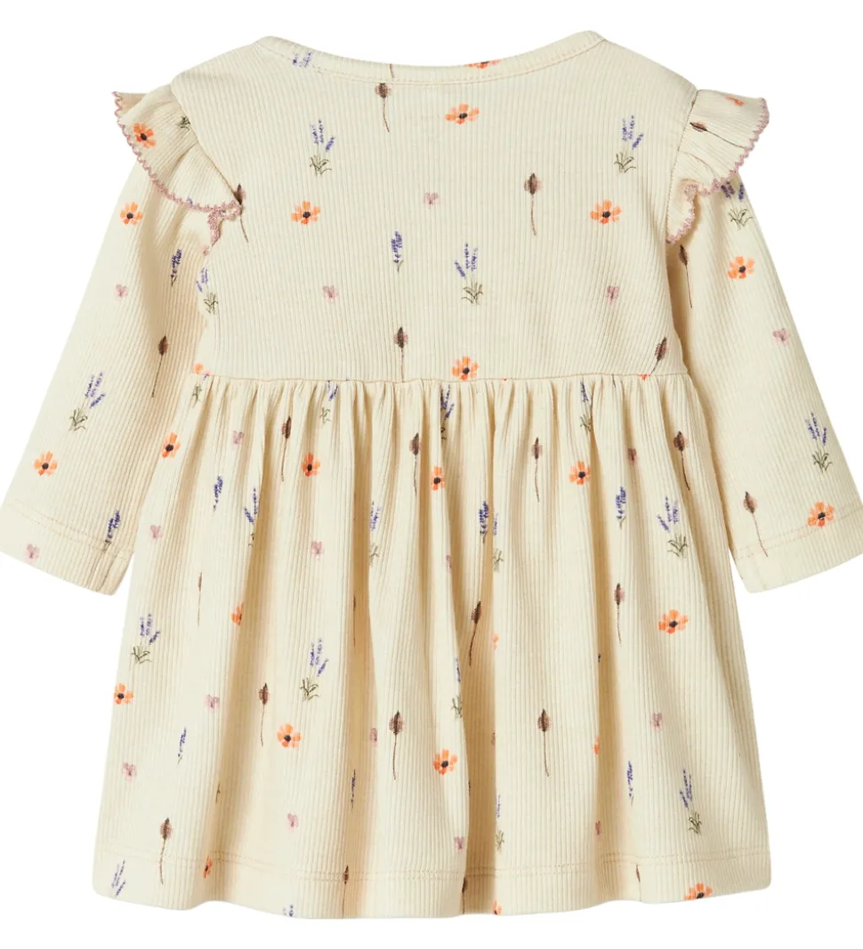 Indbydende Name It kjole i en lys beige nuance med et delikat blomsterprint i orange, lilla og brune toner. Name It kjolen har lange ærmer og fine flæsedetaljer på skuldrene. Den er designet med en rund halsudskæring og et let plisseret skørt, der giver et sødt udtryk. Kjolen åbnes ved den venstre skulder med skjulte trykknapper.