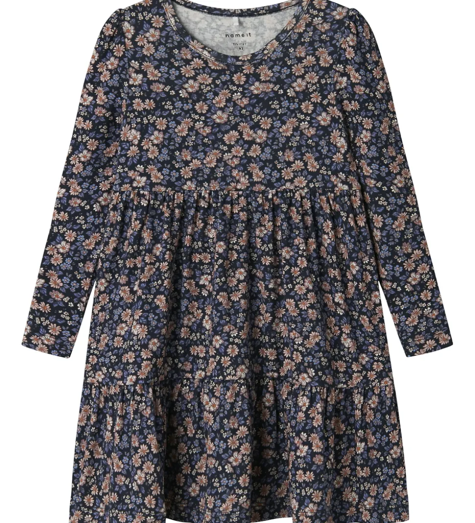 Elegant Name It kjole i navy med et smukt blomsterprint i blå og lilla nuancer. Kjolen har lange ærmer og en rund halsudskæring. Name It kjolen har en løs pasform med masser af vidde, og den har lange ærmer med søde pufskuldre.