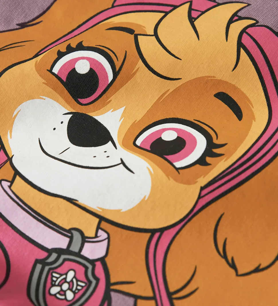 Charmerende Name It kjole i en støvet lilla nuance. Kjolen har lange ærmer med flæsedetaljer ved skuldrene. Fronten prydes af et sødt Paw Patrol print med sommerfugle og glimmerdetaljer. Name It kjolen har en behagelig rund halsudskæring og en let rynket talje.