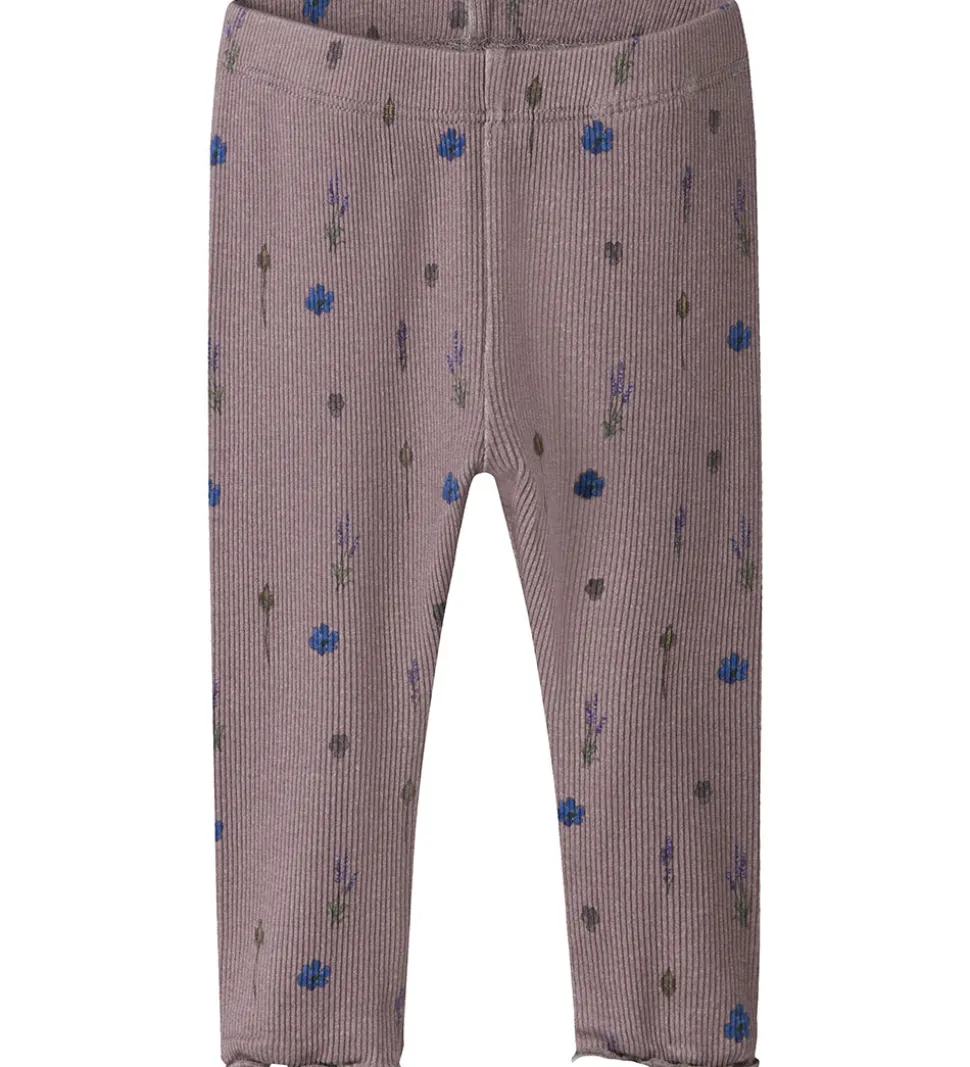 Charmerende Name It leggings i støvet lilla dekoreret med et blomstermønster i blå og grønne nuancer. Name It leggingsene har en behagelig elastisk talje og en elegant ribstruktur, der tilføjer en visuel dybde. Buksebenene har flotte, bølgende kanter.