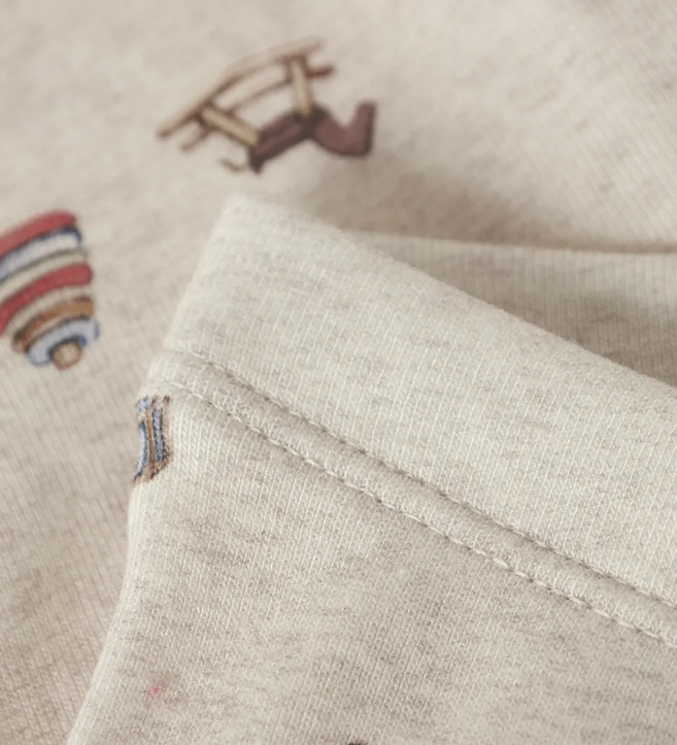 Fine Name It leggings i meleret beige med et alloverprint af forskelligt legetøj. Name It leggingsene har en elastik i taljen og en tætsiddende pasform.