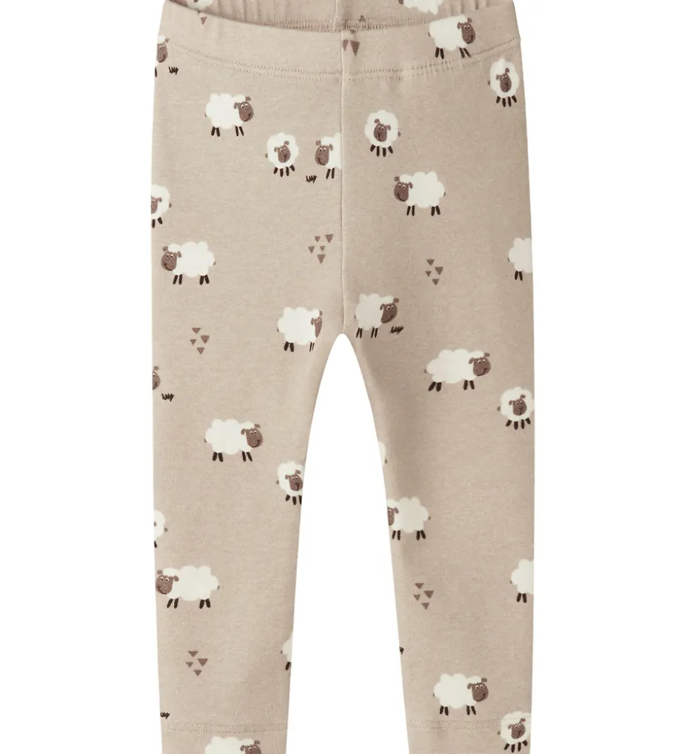 Charmerende Name It leggings i en meleret, lysebeige farve med et sødt fåremønster. Name It leggingsene har en elastisk talje for en behagelig pasform.