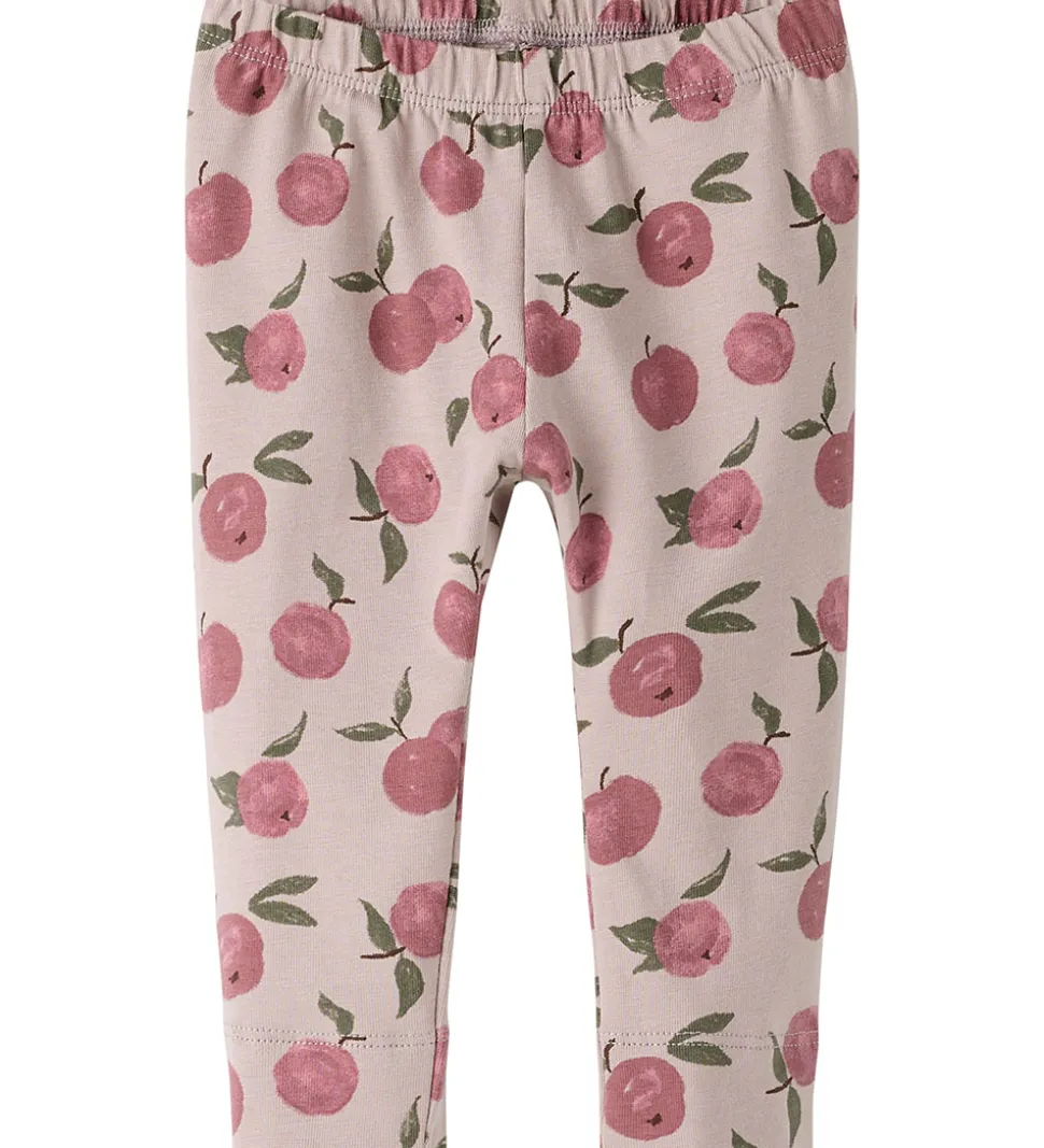Fine Name It leggings i støvet lyselilla med et alloverprint af frugter i rosa og grønne nuancer. Name It leggingsene har en elastisk talje og brede kanter ved anklerne, der sikrer en behagelig pasform.