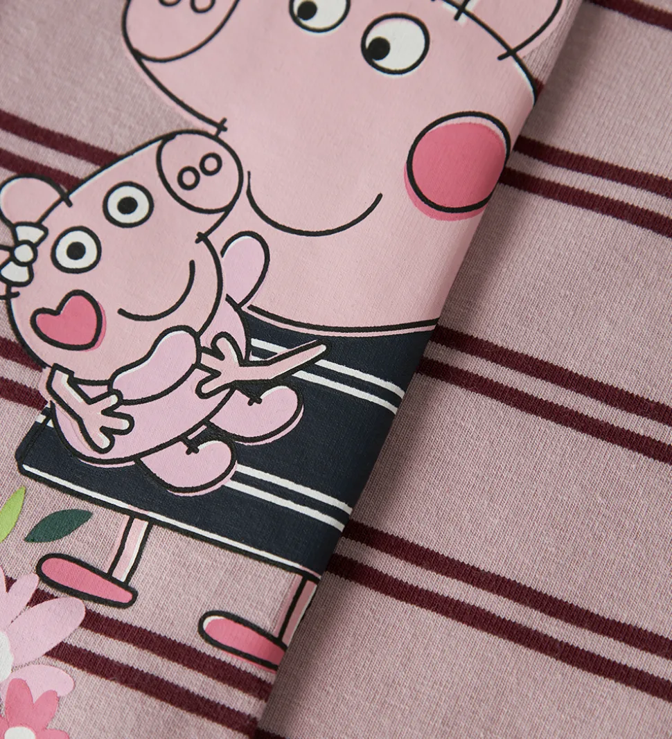 Fine Name It leggings i rosa med vandrette, bordeauxrøde striber og et print af to Gurli Gris karakterer og blomster på venstre ben. Name It leggingsene har en elastisk talje og en tætsiddende pasform.
