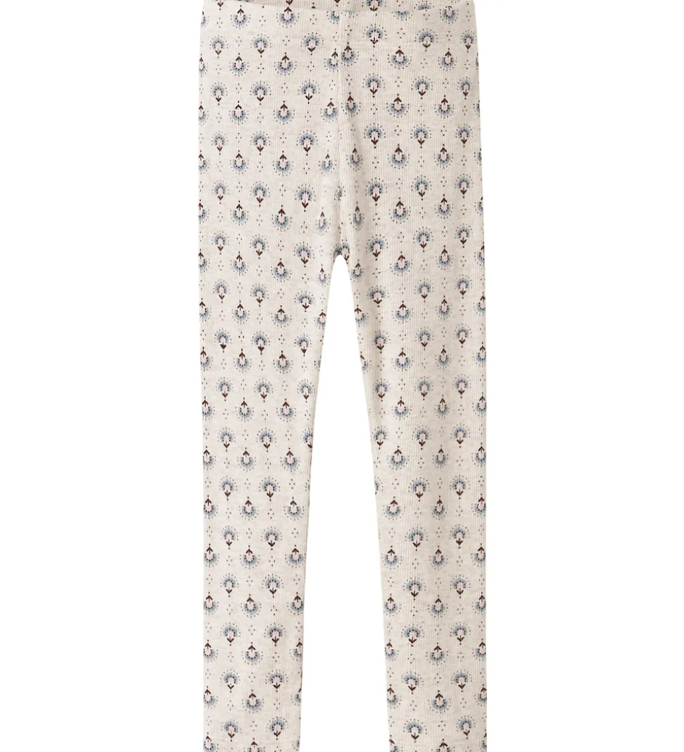 Fine Name It leggings i en lys cremefarve med et blomsterlignende mønster i blå, brun og rosa. Name It leggingsene har ribstruktur og en elastisk talje, som giver en god pasform.