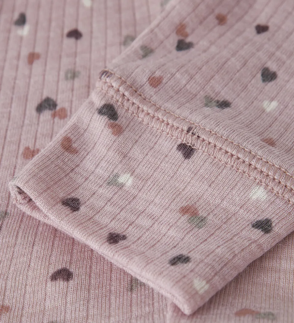 Flotte Name It leggings i rosa med et alloverprint af små hjerter i forskellige farver. Legginsene har ribstruktur og dekorative syninger på knæene. De har en god elastik i taljen, og brede ribkanter ved anklerne. Legginsene er fremstillet af merinould og modal.