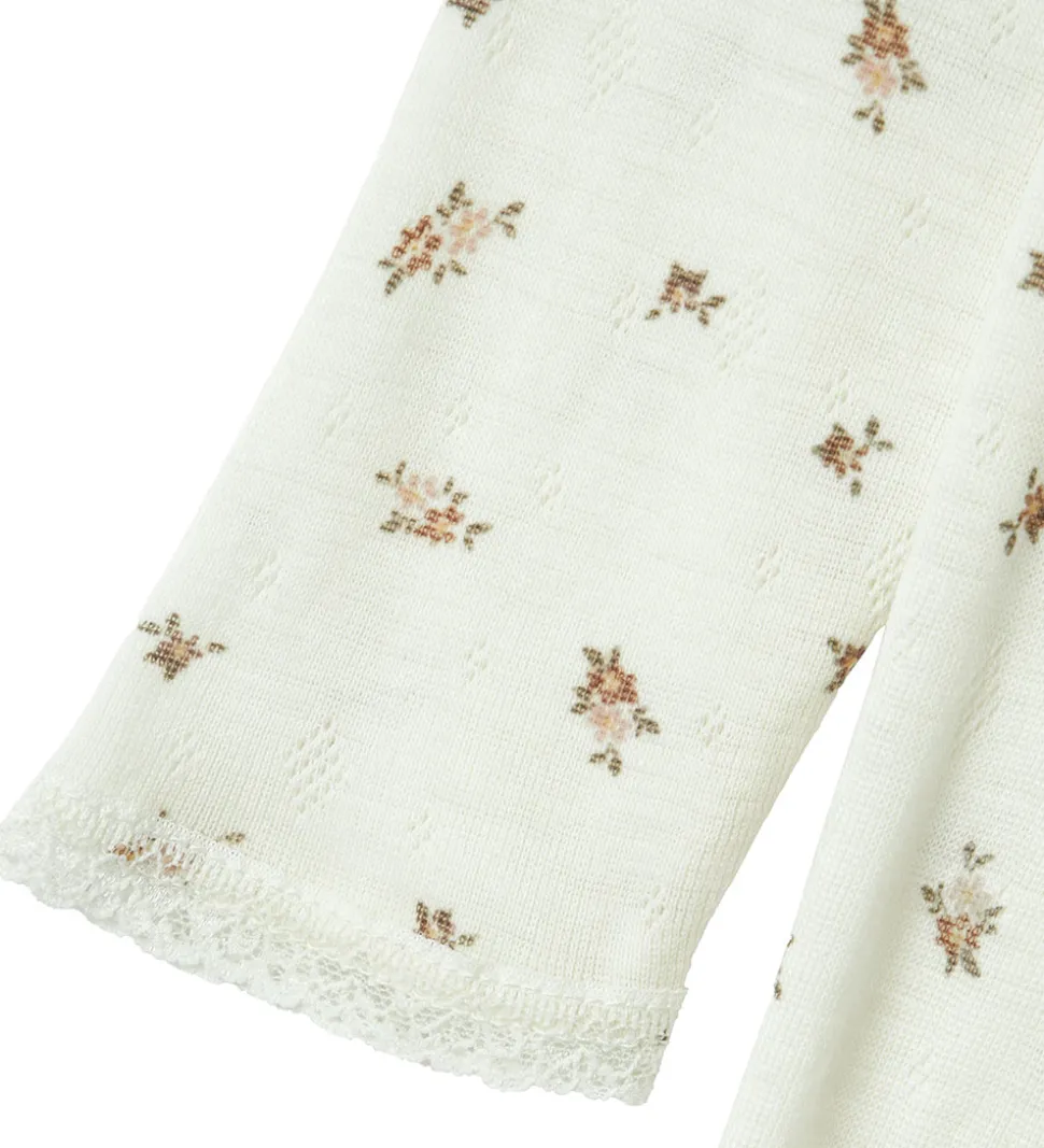 Charmerende Name It natdragt med lange ærmer i en flot råhvid nuance. Natdragten har et flot blomstermønster og er forsynet med en lynlås med hagebeskytter, som går fra halsen og ned, hvilket gør den praktisk i brug. Natdragten er fremstillet af lækkert merinould.