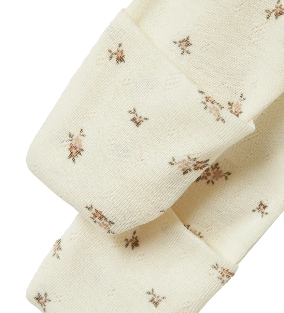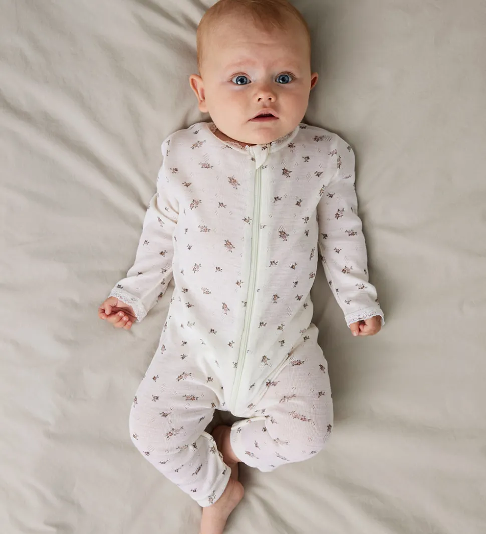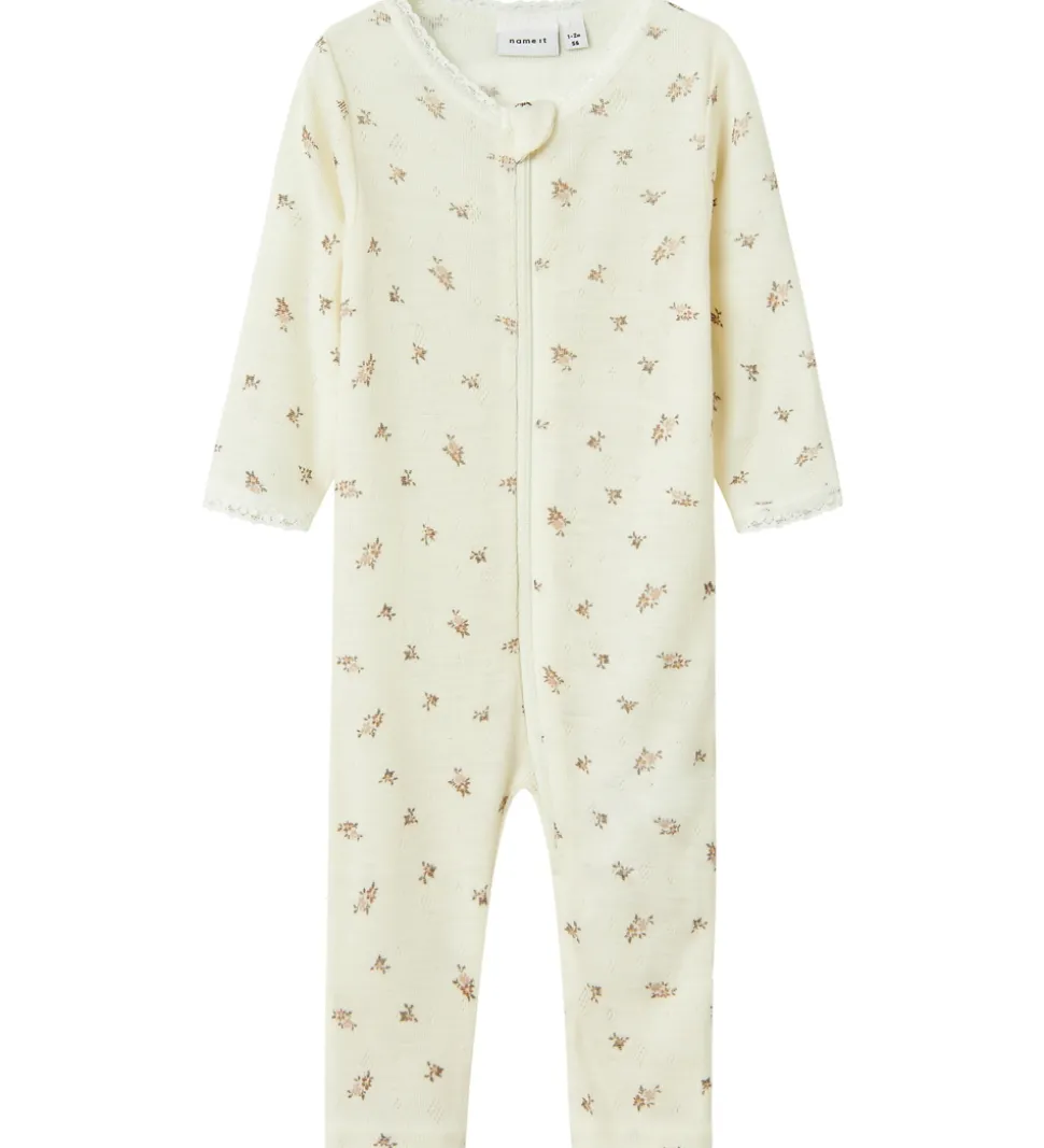 Elegant Name It natdragt med lange ærmer i en flot råhvid nuance. Natdragten er dekoreret med et diskret blomstermønster og åbnes foran med en praktisk lynlås med hagebeskytter øverst. Natdragten er fremstillet af lækkert merinould.