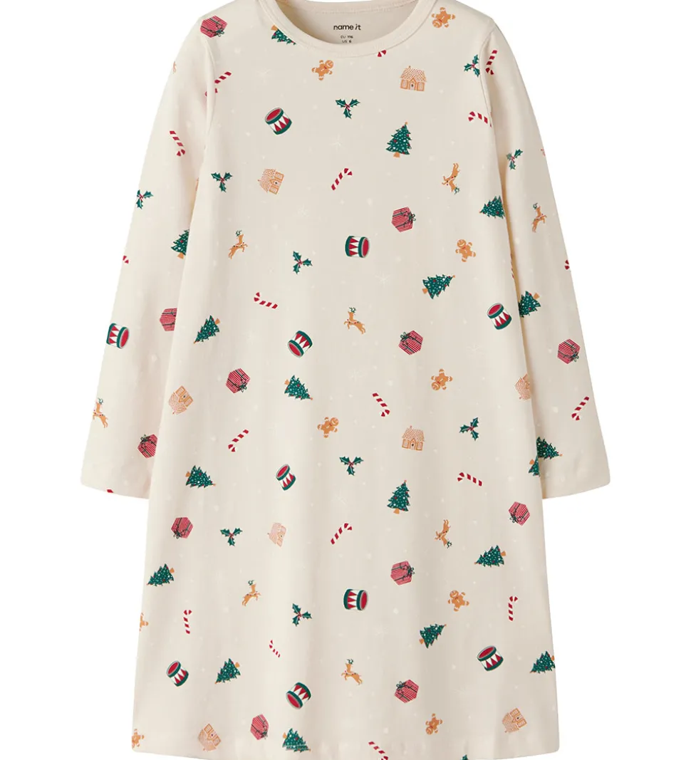 Fortryllende Name It natkjole i råhvid med et alloverprint af julemotiver. Natkjolen har en rund halsudskæring og lange ærmer. Den er fremstillet i en blød og let kvalitet.