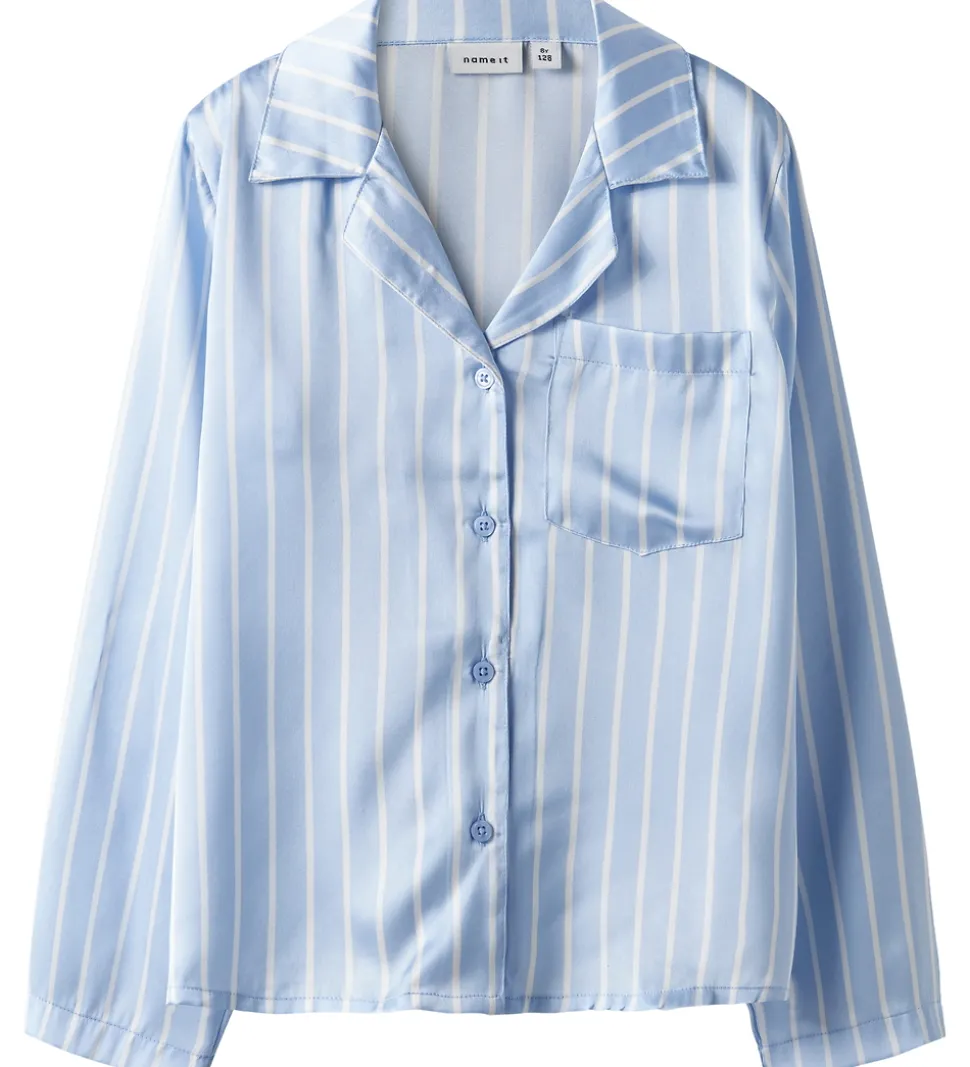 Flot Name It natskjorte i blå satin med hvide striber. Natskjorten har en skjortekrave og gennemgående knapper. Fortil er der en smart brystlomme. Natskjorten er fremstillet i en let og behagelig kvalitet.