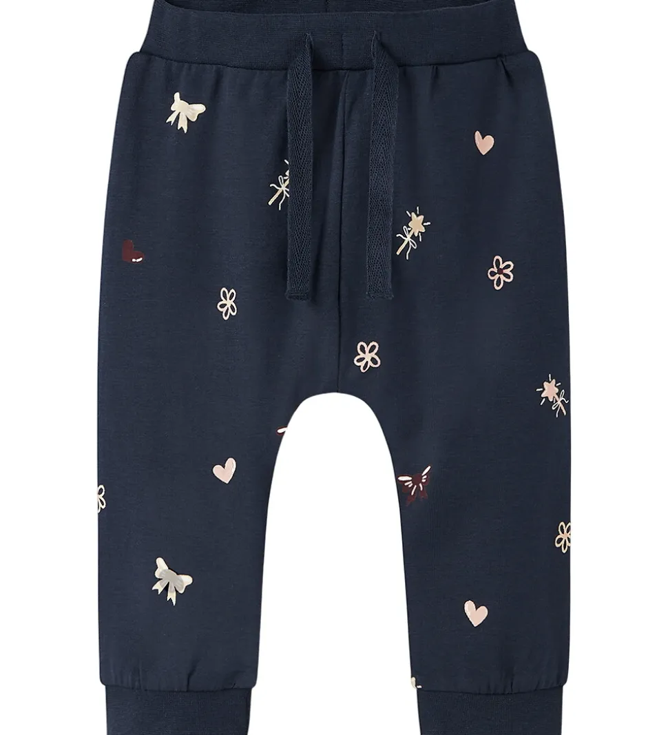 Charmerende Name It nattøj bestående af en rosa natbluse og et par navyblå natbukser. Nablusen har et fint print på fronten af en tryllestav og stjerner i guld glimmer og hvid, mens natbukserne har et alloverprint af små motiver i rosa og beige nuancer.
