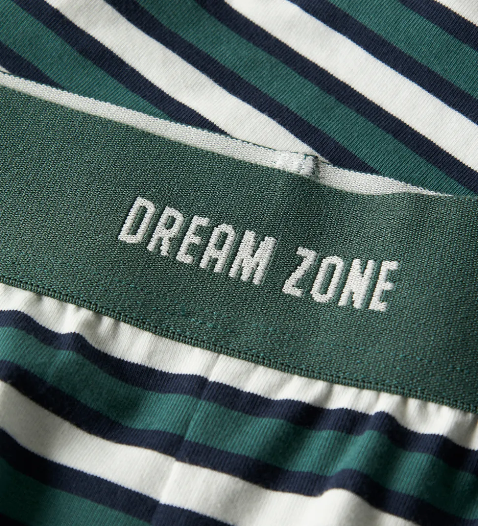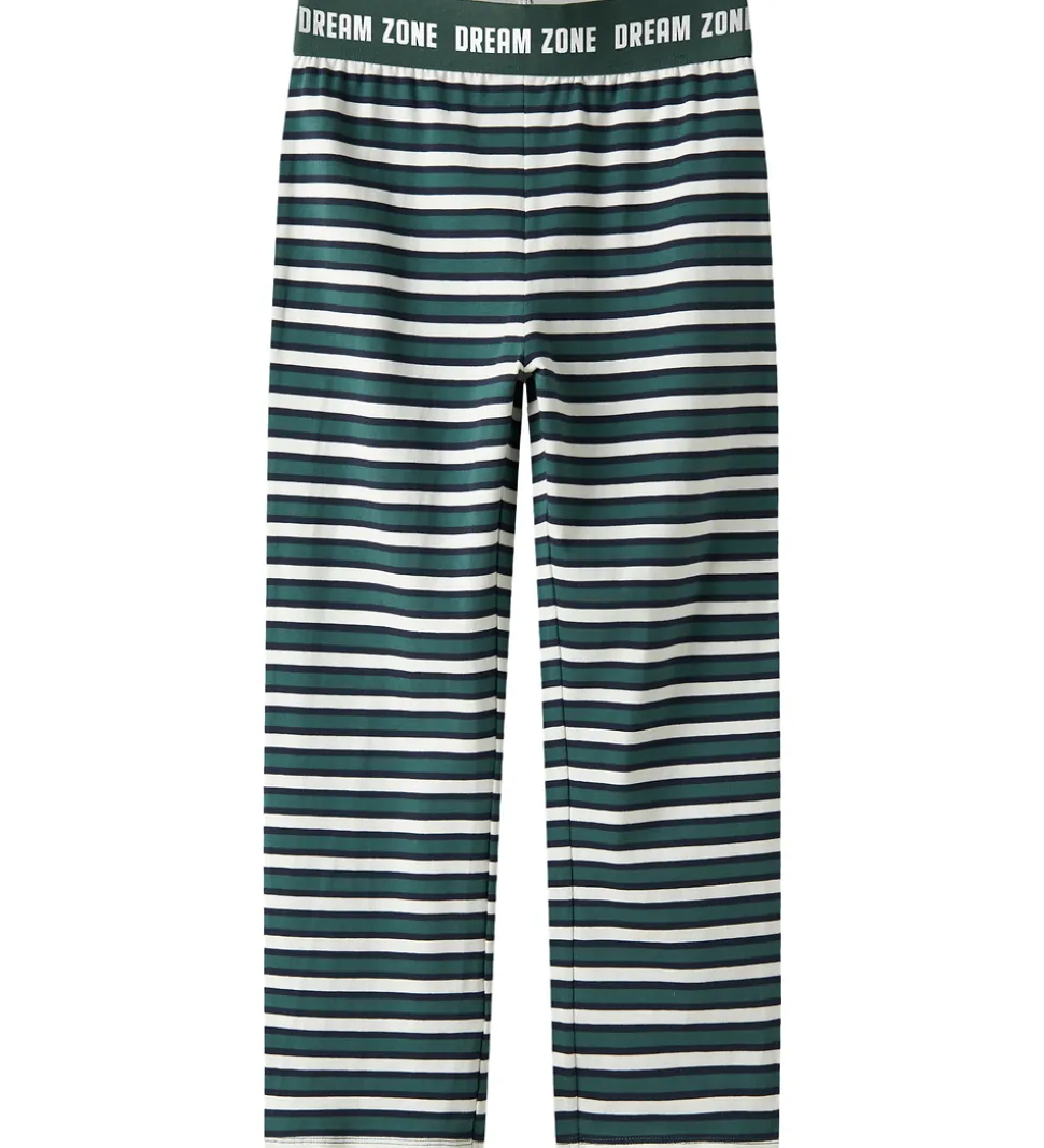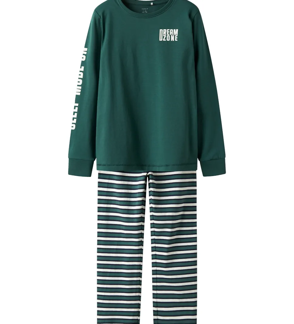 Stilfuldt Name It nattøj bestående af en natbluse og et par natbukser. Natblusen er grøn med lange ærmer og har et hvidt print på brystet og ærmet. Natbukserne har smalle striber i grøn og hvid, samt en elastisk talje der sikrer en god pasform.