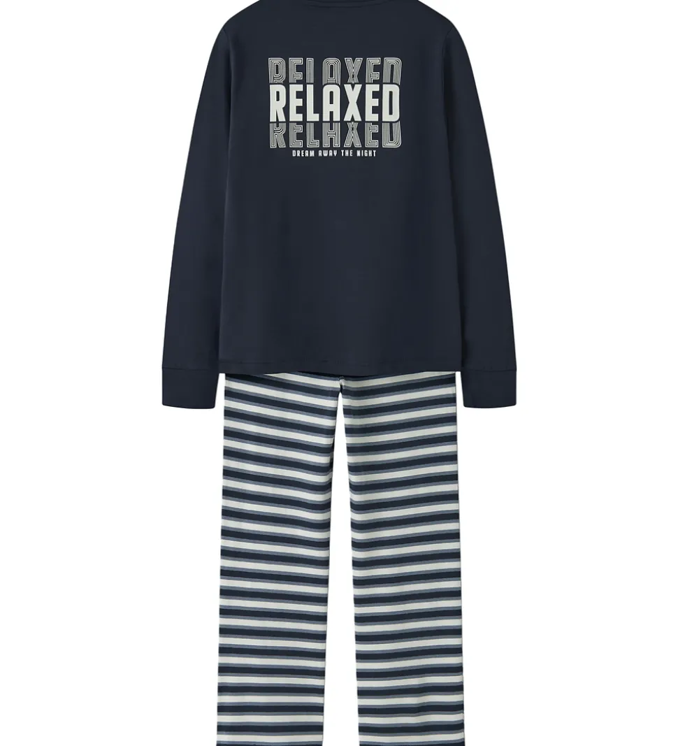 Blusen er navyblå med et hvidt print på brystet og bagsiden. Natbukserne har et klassisk, stribet mønster i hvide og blå nuancer der komplimenterer overdelen, samt en elastisk talje, der sikrer en god pasform.