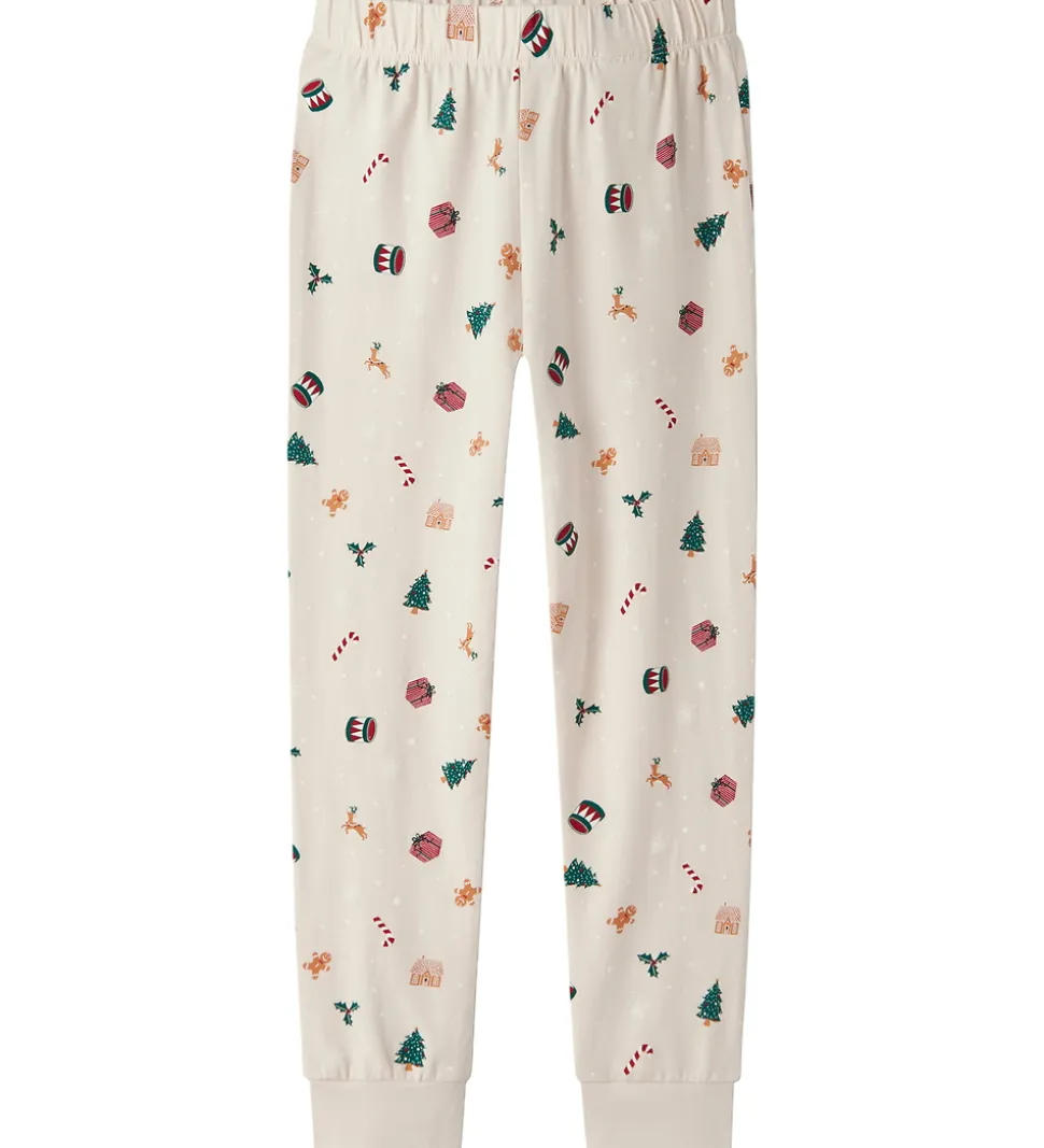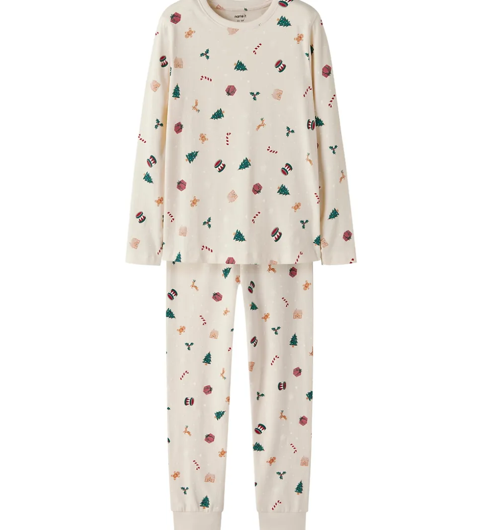 Lækkert Name It nattøj i råhvid med et alloverprint af julemotiver. Nattøjet består af en langærmet natbluse og et par natbukser med elastik i taljen og ribkanter ved anklerne.