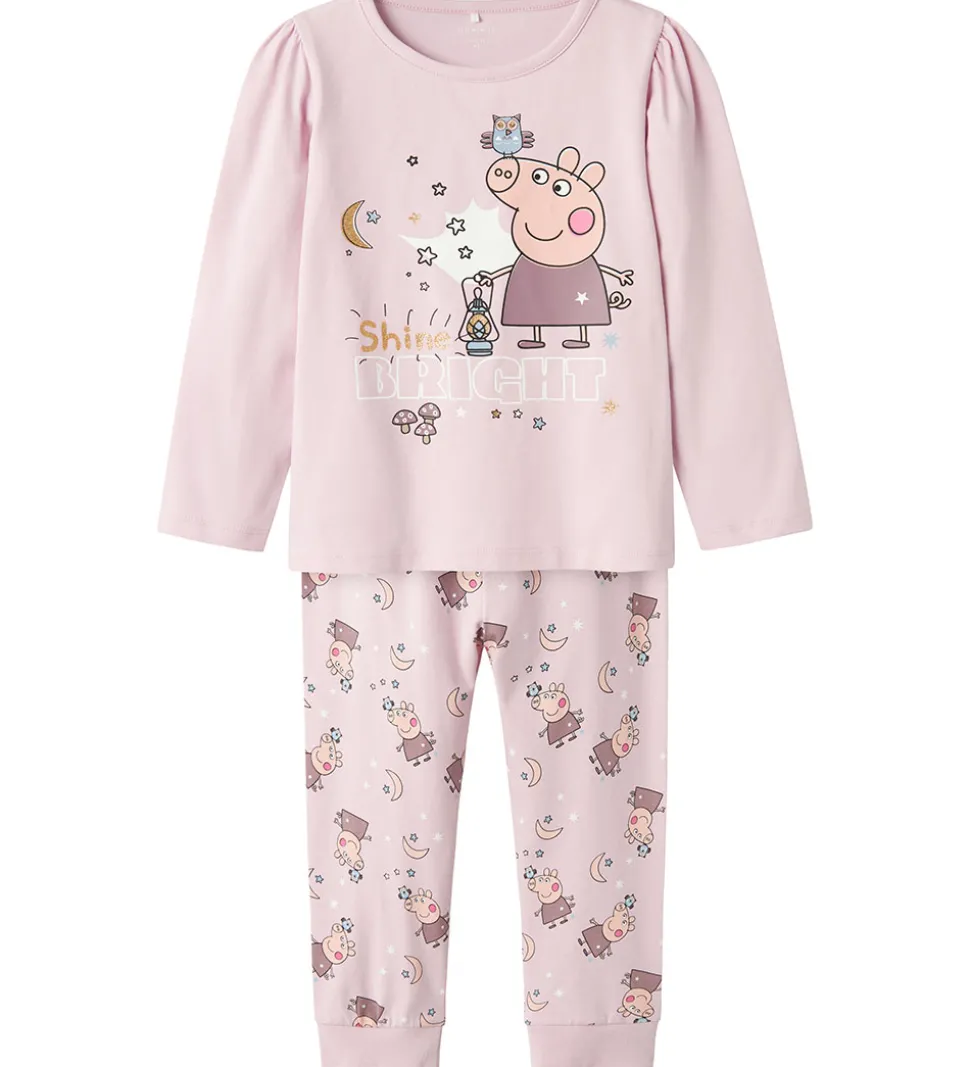 Lækkert Name It nattøj, som er 2-delt og i en fin lys rosa nuance med et farverigt print af karakteren fra Gurli Gris og søde stjerner samt måner på bukserne. Toppen har lange ærmer og flot motiv.
