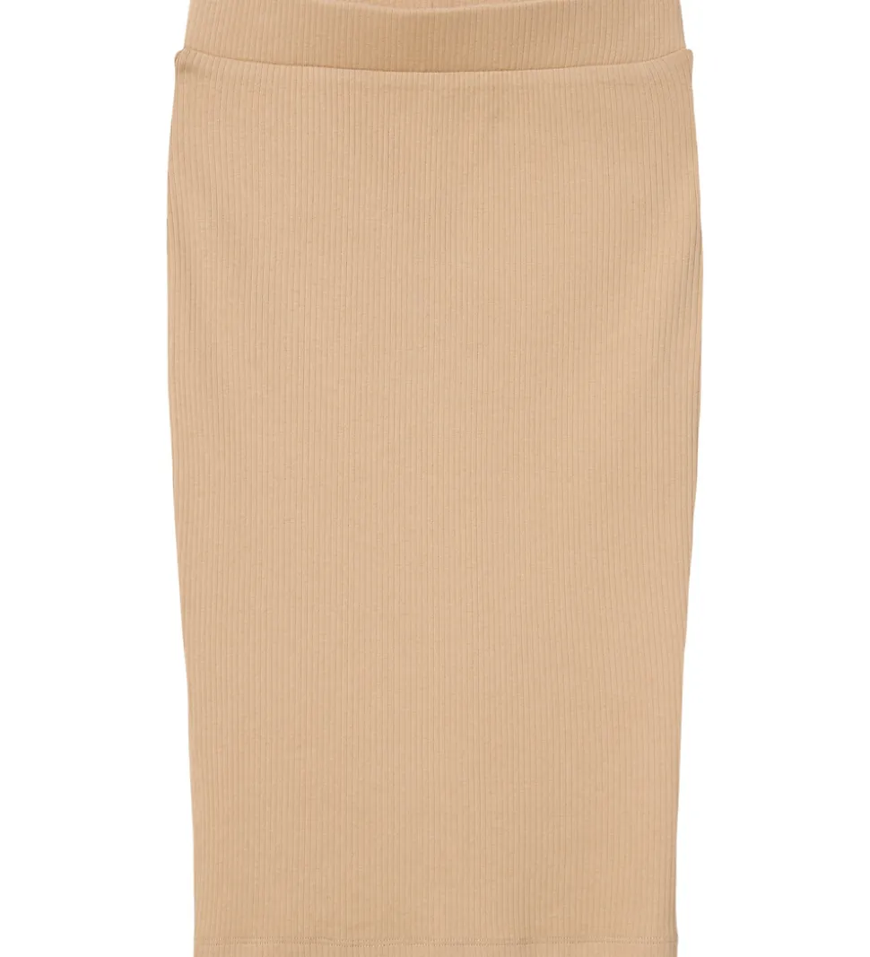 FIn Name It nederdel i beige med ribstruktur. Nederdelen er en mellemlang model med tætsiddende pasform. Den har en bred elastik i taljen, og en slids nederst i begge side.
