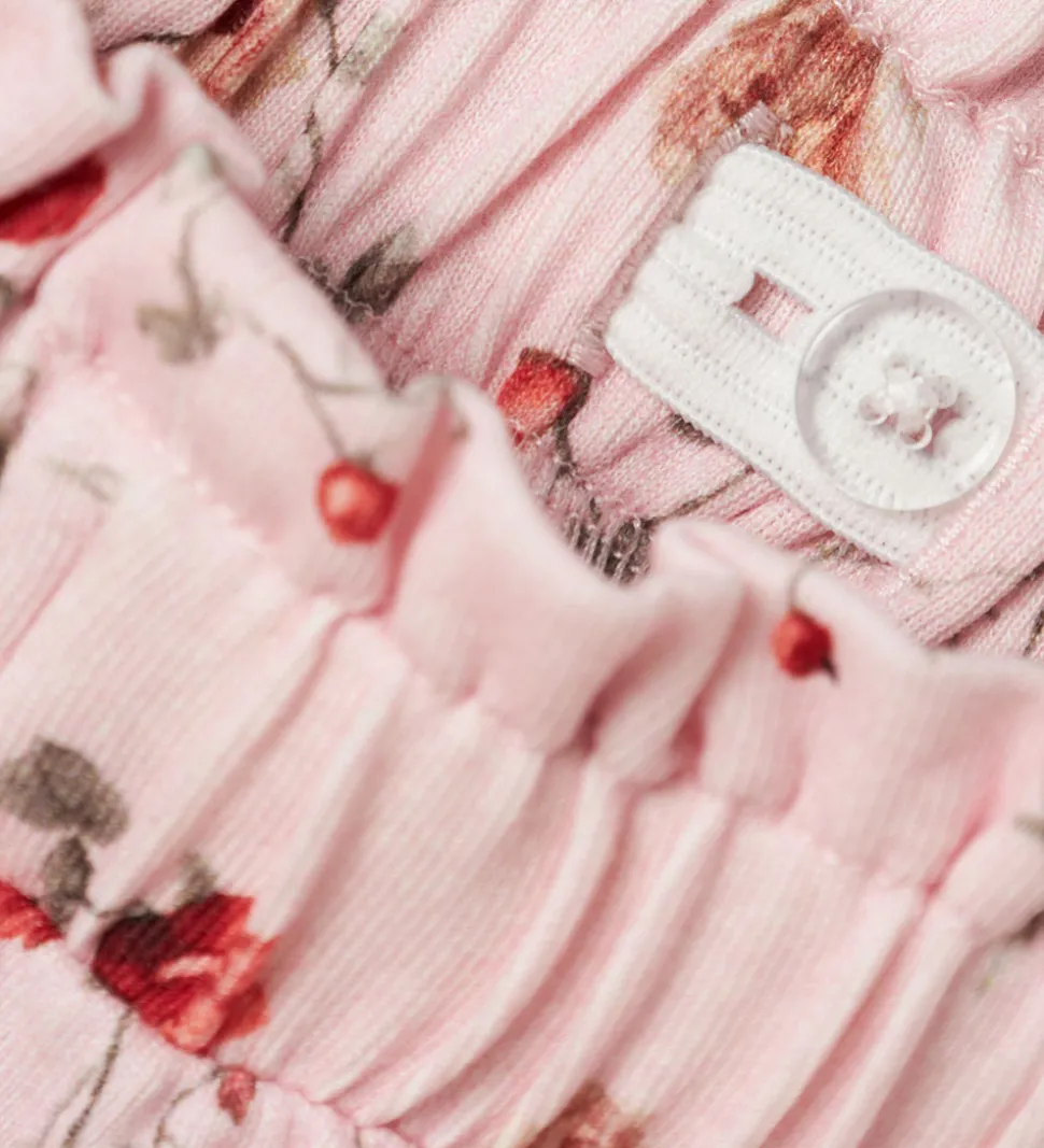 Skøn Name It nederdel i en lys, rosa nuance med et smukt blomstermønster i røde og grønne toner. Name It nederdelen har en blød, elastisk talje der sikrer god komfort.