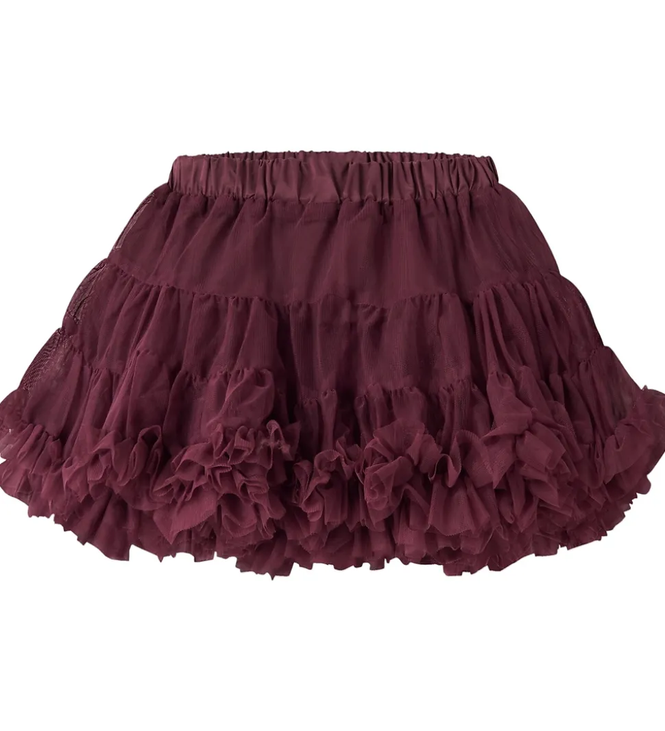 Elegant Name It nederdel i en dyb bordeaux farve. Nederdelen har et skørt med flere lag, der skaber et flot voluminøst look. Name It nederdelen er designet med en elastisk talje, der sikrer en god pasform.