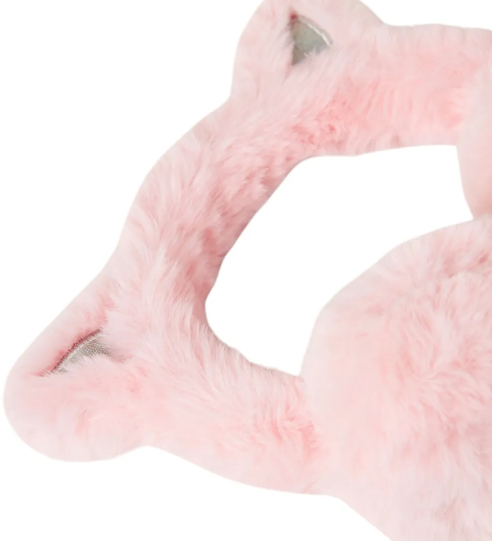 Flotte Name It ørevarmere i rosa plys med katteører på toppen. Ørevarmerne består af to vatterede puder med en bue imellem, så de sidder godt på hovedet.