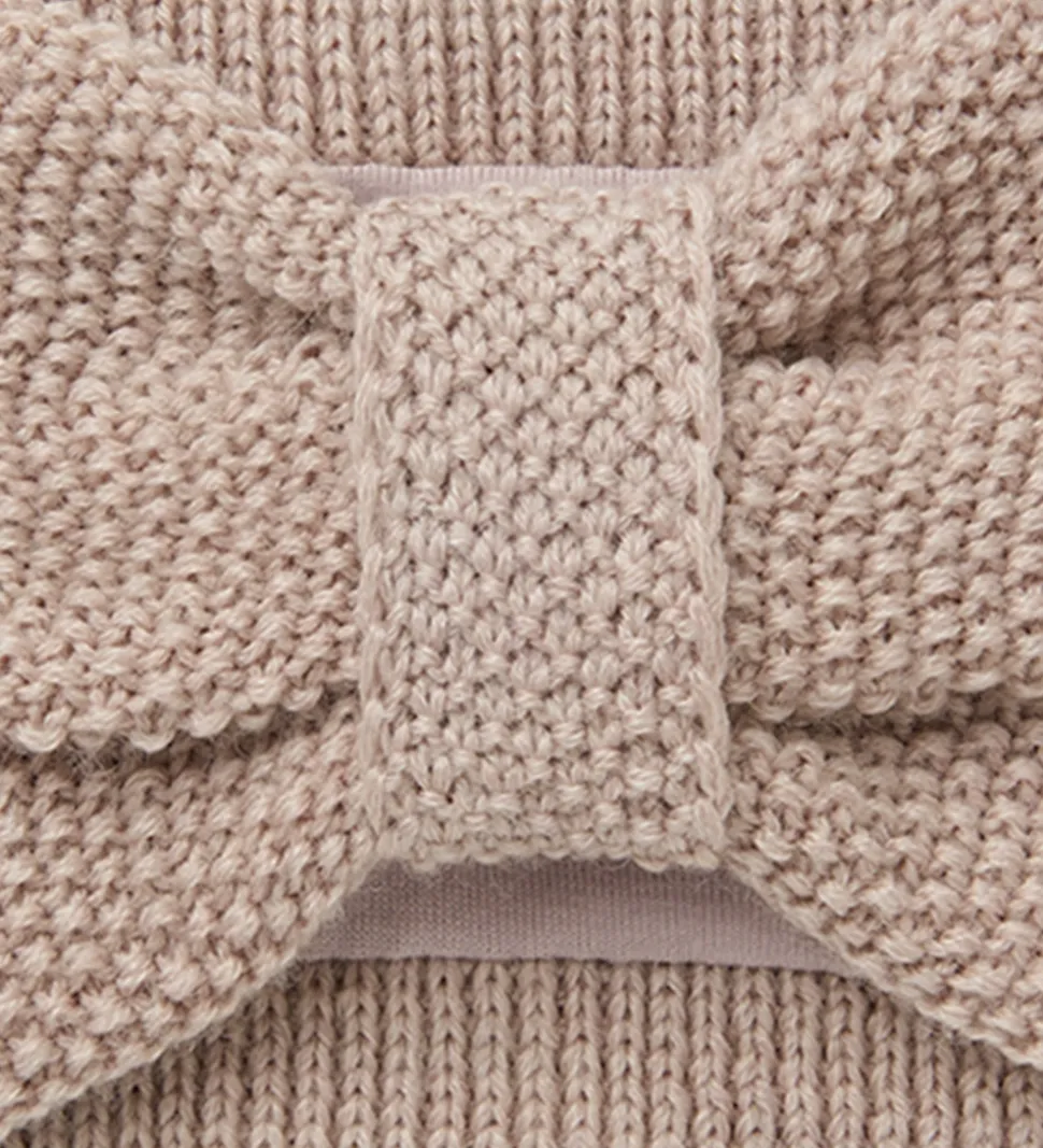 Elegant Name It pandebånd i støvet rosa med sløjfedesign. Pandebåndet har en strikket struktur og består af to lag. Inderst er der blødt bomuld, mens det yderste lag er i merinould.