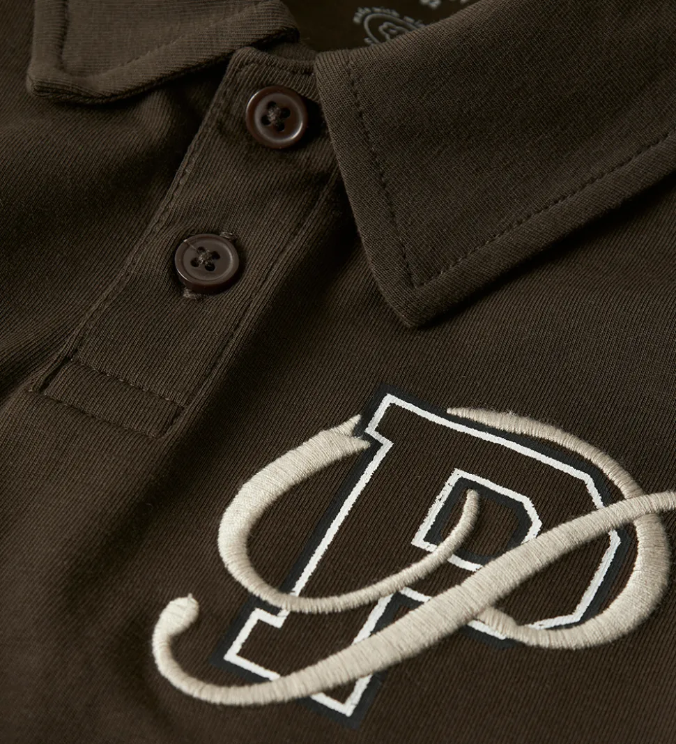 Stilren Name It bluse med lange ærmer i en dyb brun nuance. På brystet ses et flot print og broderi med bogstavet “P”. Blusen har en klassisk polokrave med knaplukning. Ribkanterne ved ærmerne giver en flot afslutning.