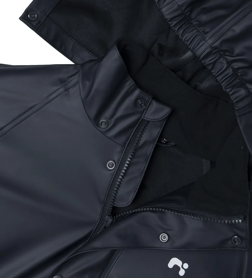 Flot Name It regntøj af PU bestående af en regnjakke og et par regnbukser i navyblå med et lille reflekslogo på venstre bryst og nederst på ryggen.