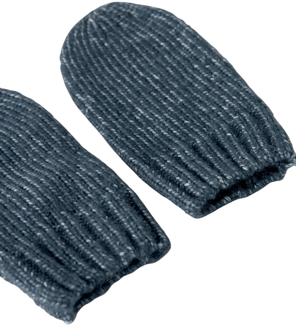 Lækkert Name It sæt bestående af en hue samt et par luffer i meleret, mørkeblå strik.