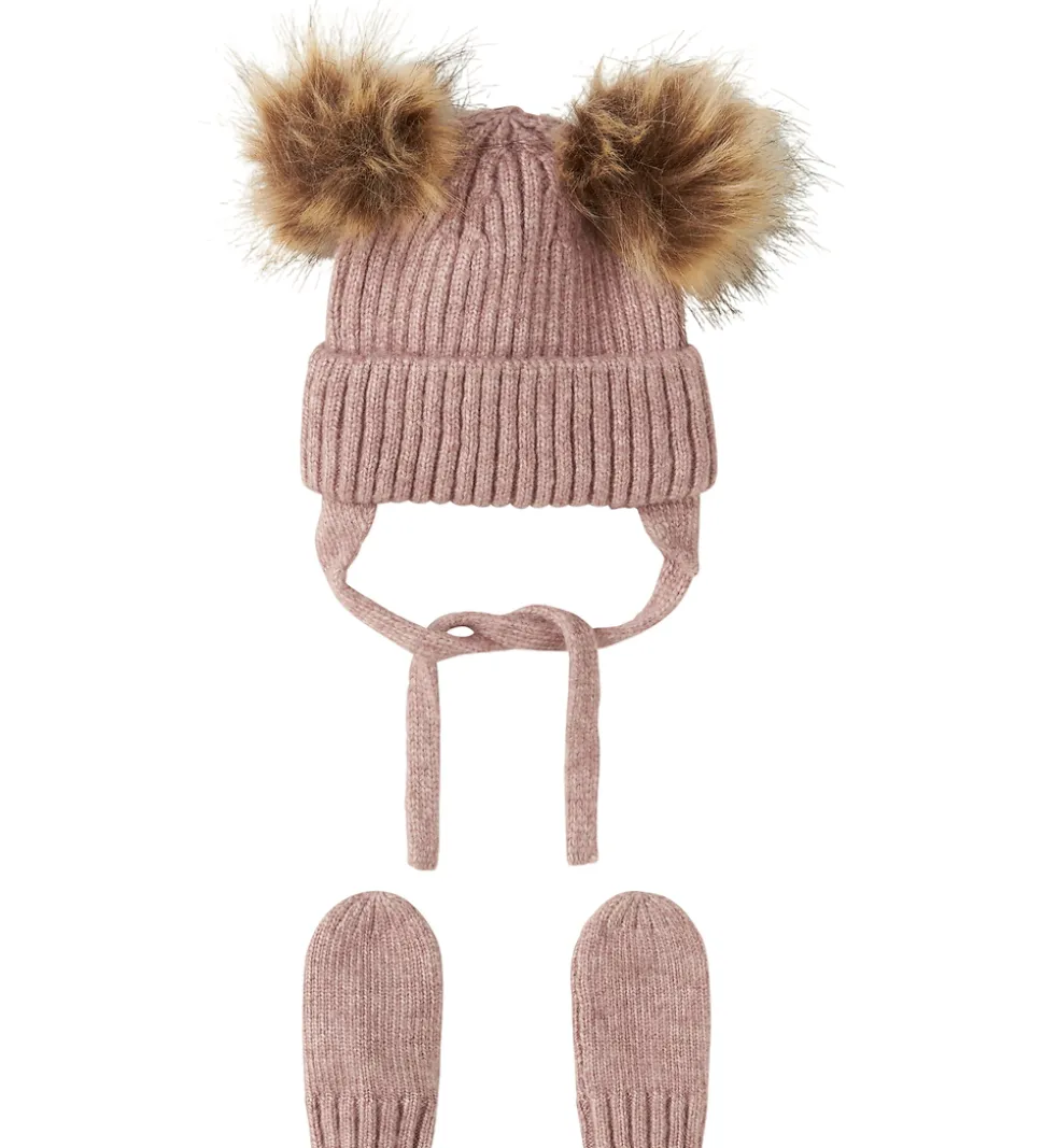 Lækkert Name It sæt bestående af en en hue samt et par luffer i meleret, rosa strik.