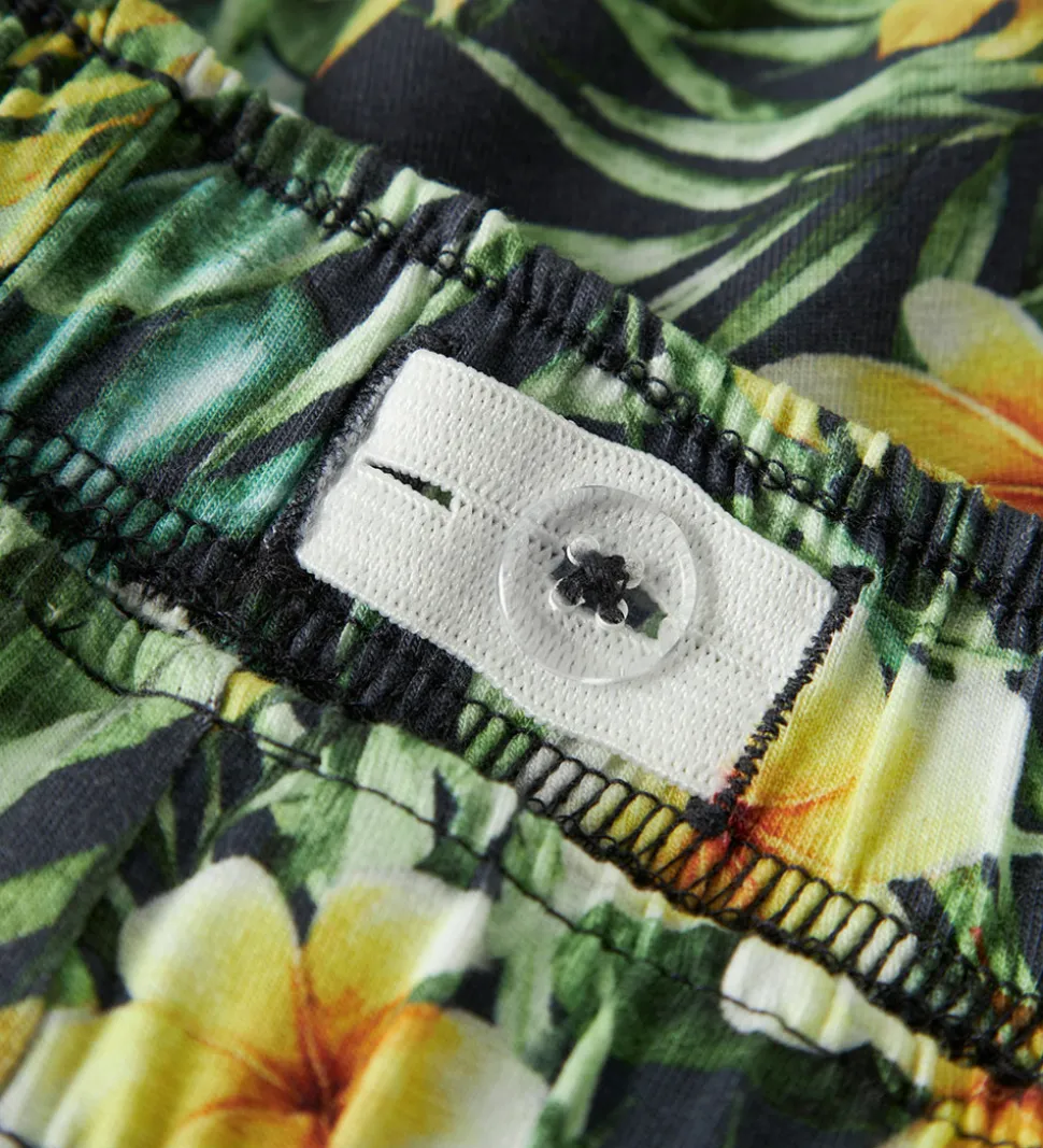 Flotte Name It shorts i dyb navyblå med et alloverprint af blomster og blade i grønne og gule nuancer. Name It shortsene har en elastisk talje, som kan justeres med knapper indvendigt. Shortsene har korte ben, som afsluttes med en bølget kant.