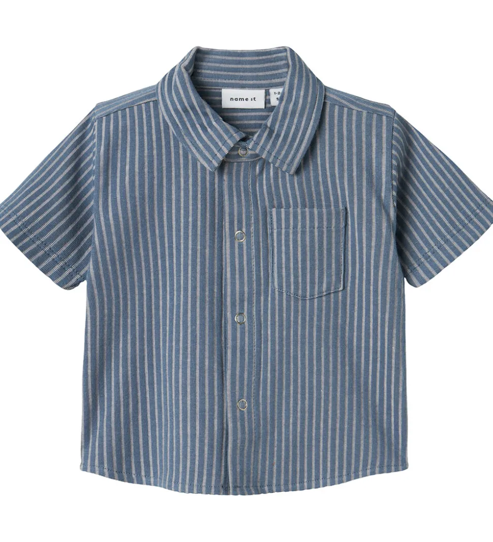 Name It skjorten har korte ærmer og åbnes fortil med trykknapper. I halsen er der en flot krave.