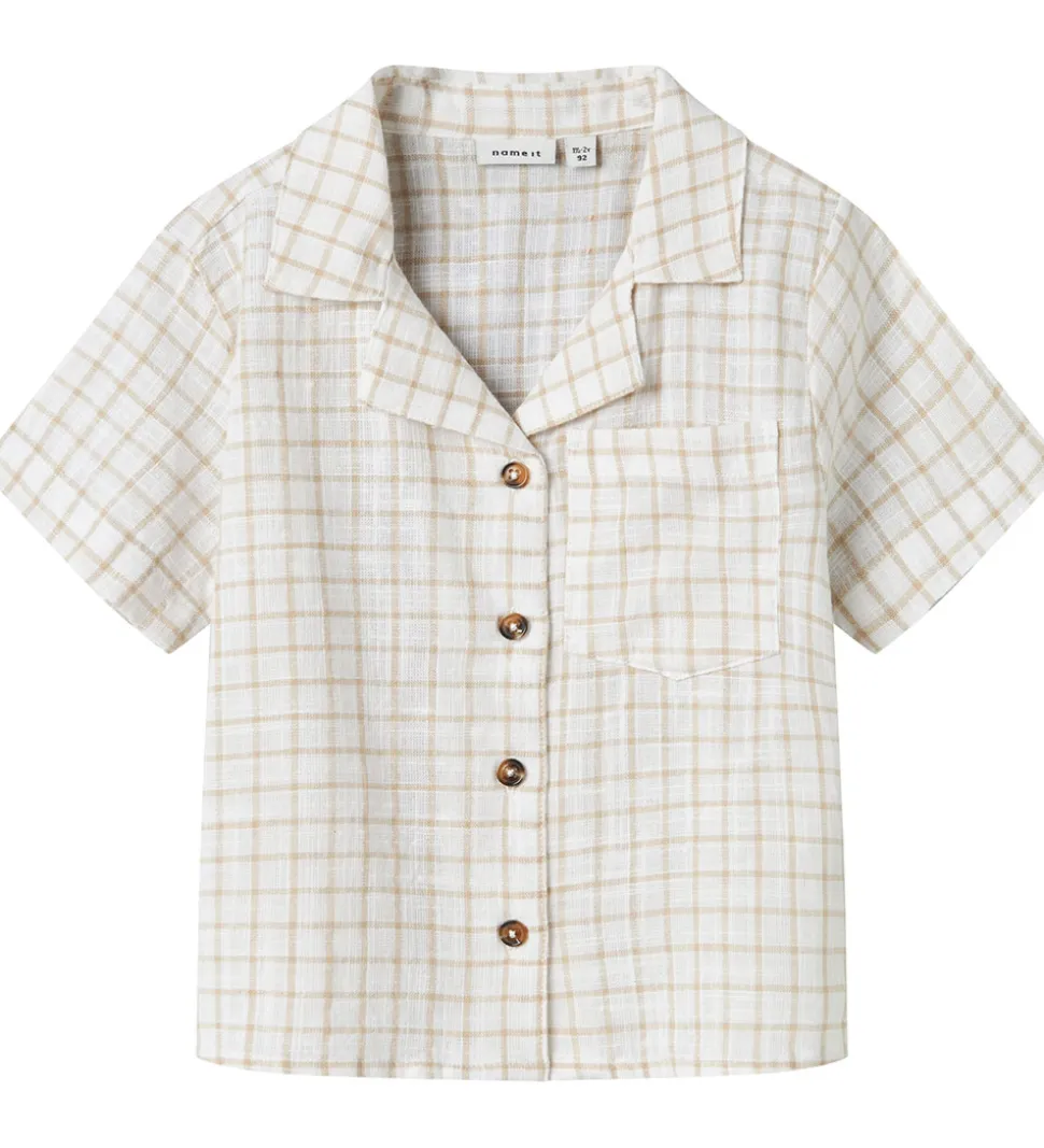 Elegant Name It skjorte i hvid med et ternet mønster i lys beige, som giver et tidløst udtryk.
