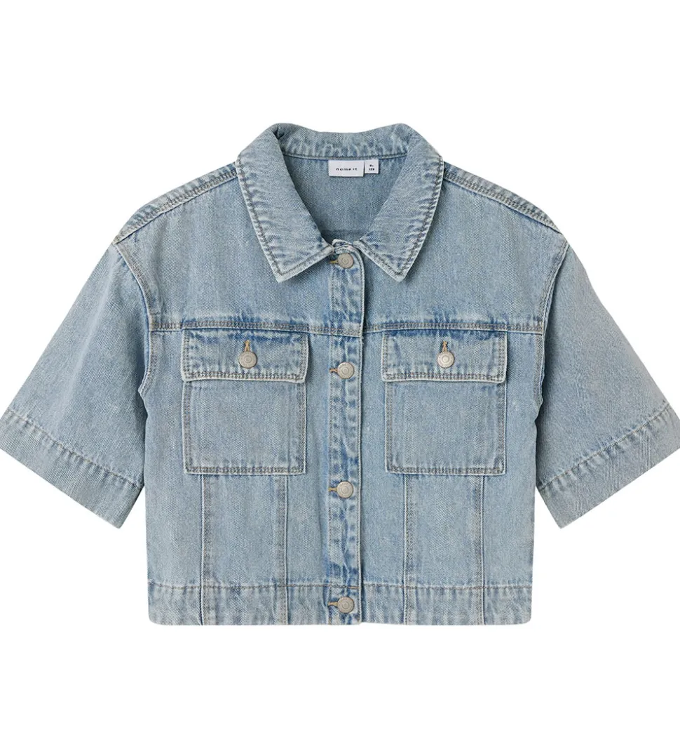 Skøn Name It skjorte i blå denim med korte ærmer og to praktiske brystlommer. Det enkle design gør skjorten til et alsidigt valg til forskellige anledninger.