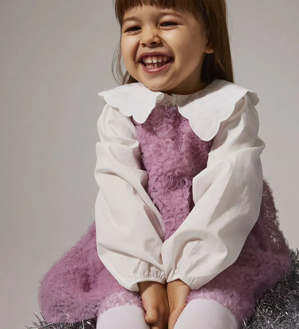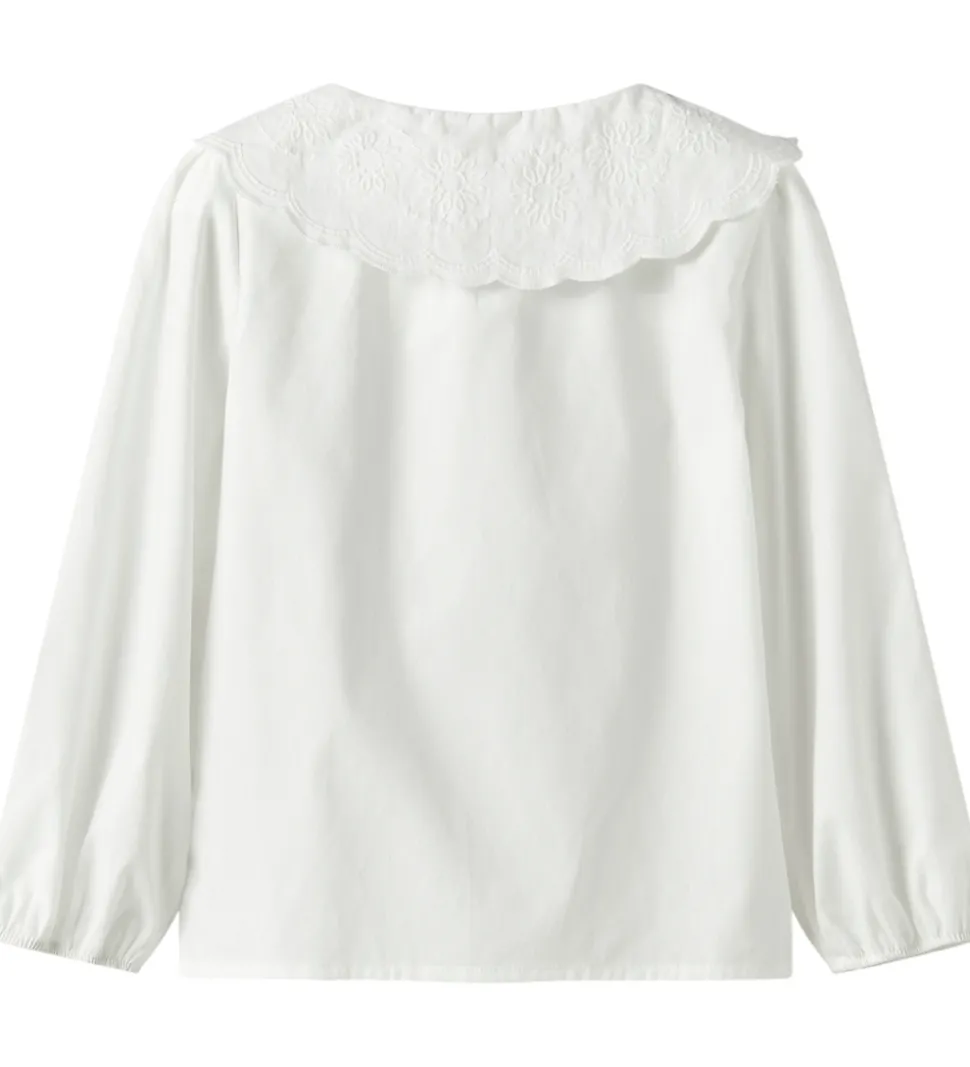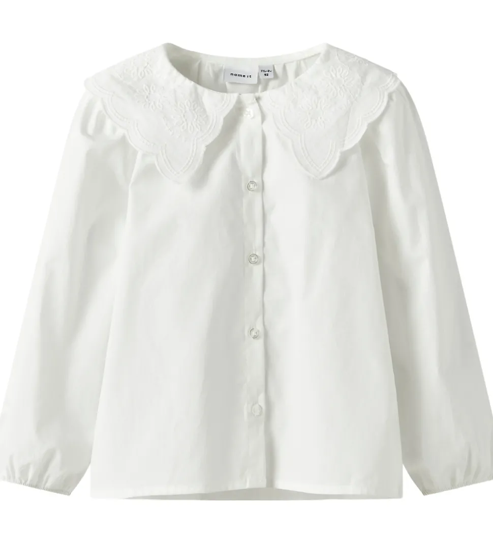 Charmerende Name It skjorte i hvidt bomuldspoplin. Skjorten har en elegant krave med dekorative broderidetaljer. Den lukkes fortil med gennemgående knapper, og den har lange, vide ærmer med elastik ved håndleddene.