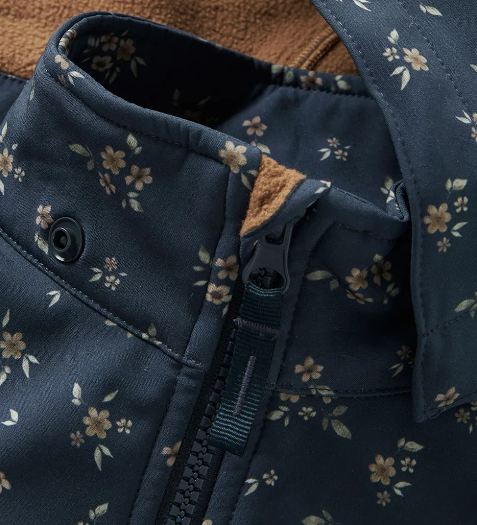 Dejlig Name It softshelldragt i mørkeblå med et fint alloverblomsterprint. Omkring skuldrene er softshelldragten dekoreret med flotte flæsekanter.