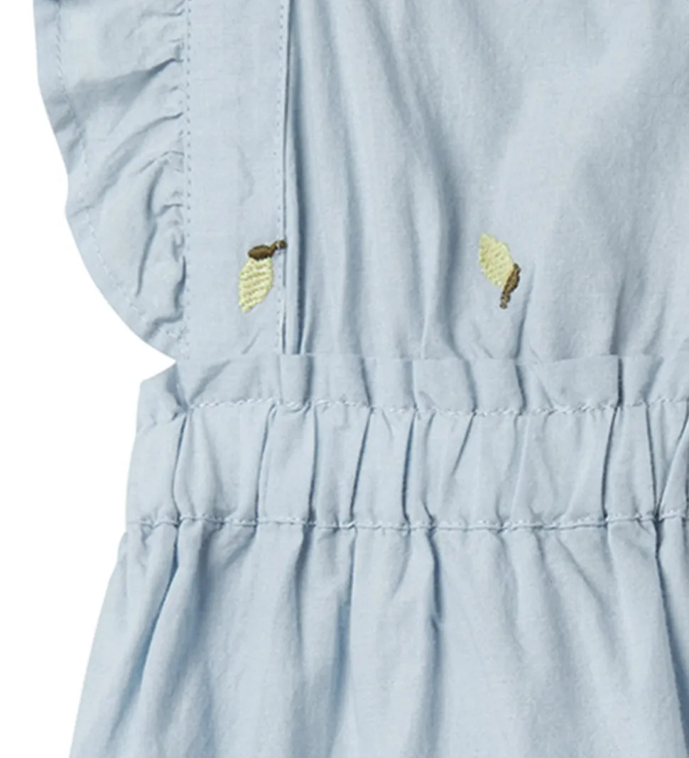 Lækker Name It sommerdragt i en lyseblå farve med små broderede detaljer. Sommerdragten har søde flæser ved skuldrene og en elastisk talje, hvilket giver en fin pasform til dit barn.