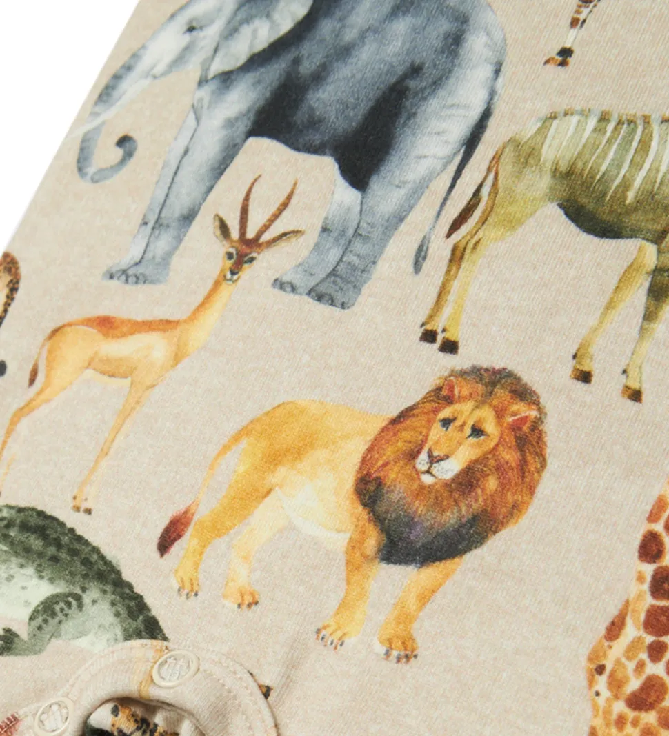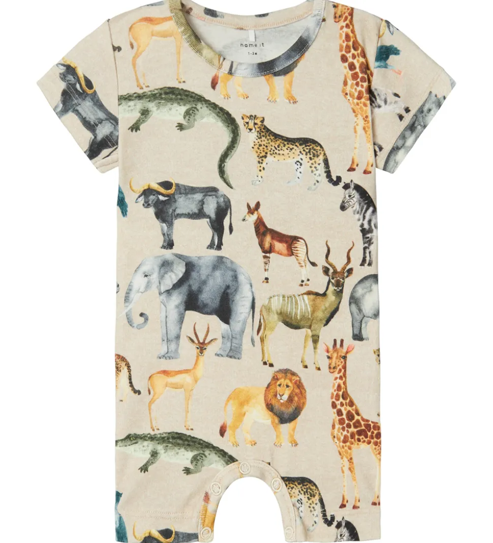 Skøn Name It sommerdragt i beige med et allover print af forskellige afrikanske dyr.