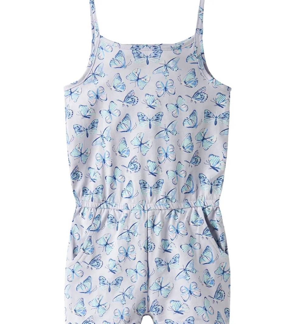 Fin Name It sommerdragt i lys lilla med et alloverprint af sommerfugle. Sommerdragten har smalle skulderstropper og en elastik omkring taljen. I siderne er der lommer. Sommerdragten har korte ben og lukkes mellem benene med trykknapper.
