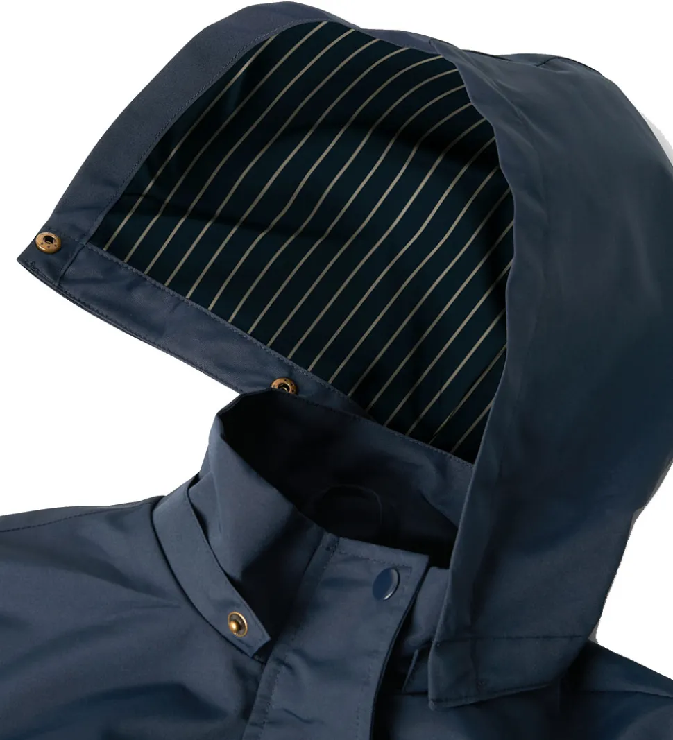 Name It sommerjakken er en lang model, som går ned over numsen. Den har en aftagelig hætte, som fæstnes med trykknapper langs den høje halskrave. I ærmeåbningerne er der praktiske elastikkanter. Omkring taljen er der en bred elastikkant med dekorative bindebånd, så den får en mere figursyet pasform.