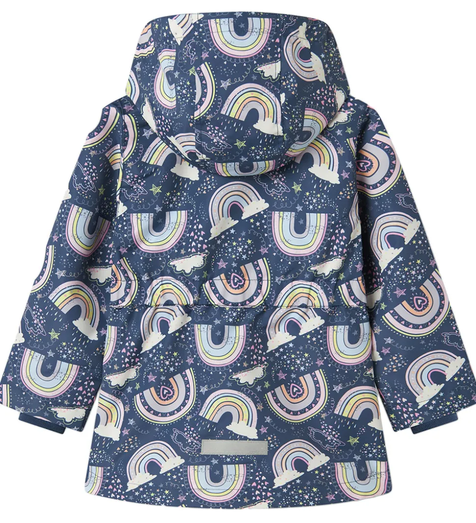 Skøn Name It sommerjakke i en dyb blå nuance med et livligt print af regnbuer og stjerner. På fronten er der reflekspipings, mens der på ryggen er en lille refleksapplikation nederst.